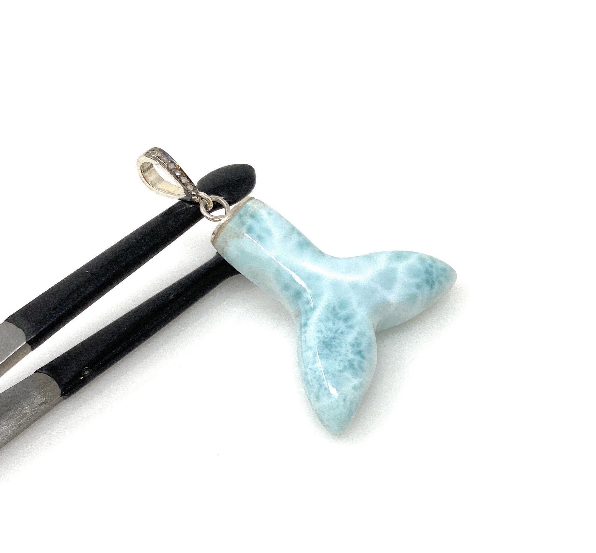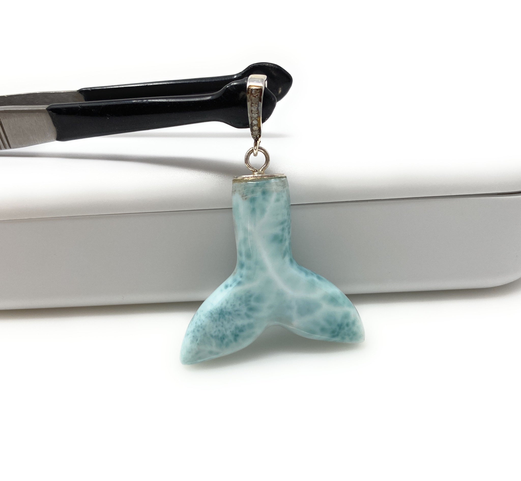 12g Larimar Mermaid Tail Pendant, Sterling Silver Pave Diamond Pendant, Bohemian Jewelry, Larimar Whale Tail Pendant