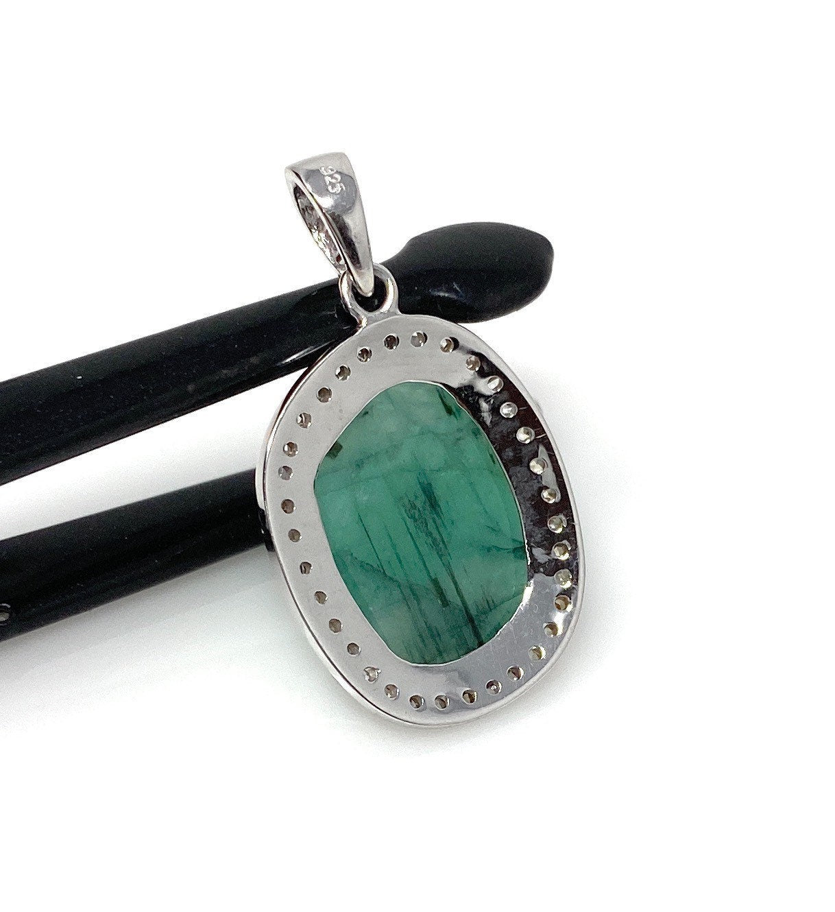 Emerald Diamond Pendant, Natural Emerald Sterling Silver Pendant, May Birthstone Pendant, Pave Diamond Pendant, 1.40” x 0.75”
