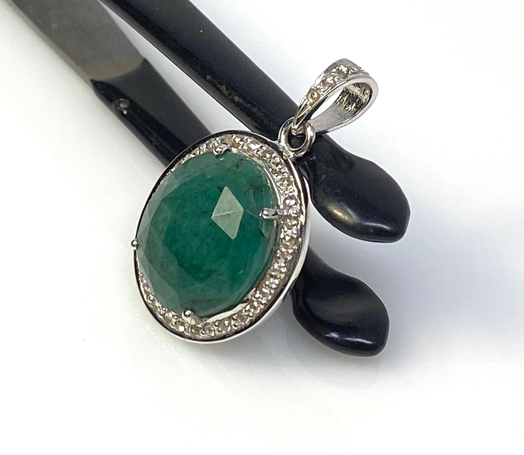 Emerald Diamond Pendant, Natural Emerald Sterling Silver Pendant, May Birthstone Pendant, Pave Diamond Pendant, 1.20” x 0.75”
