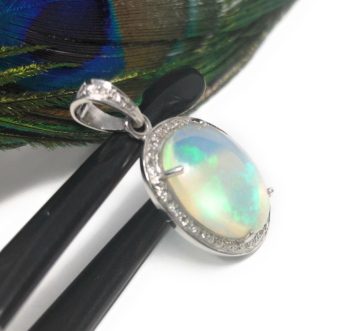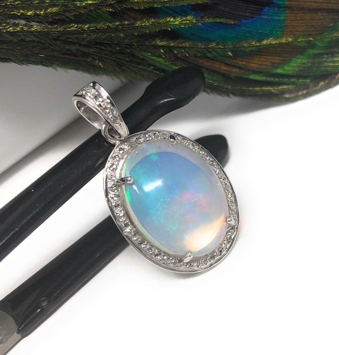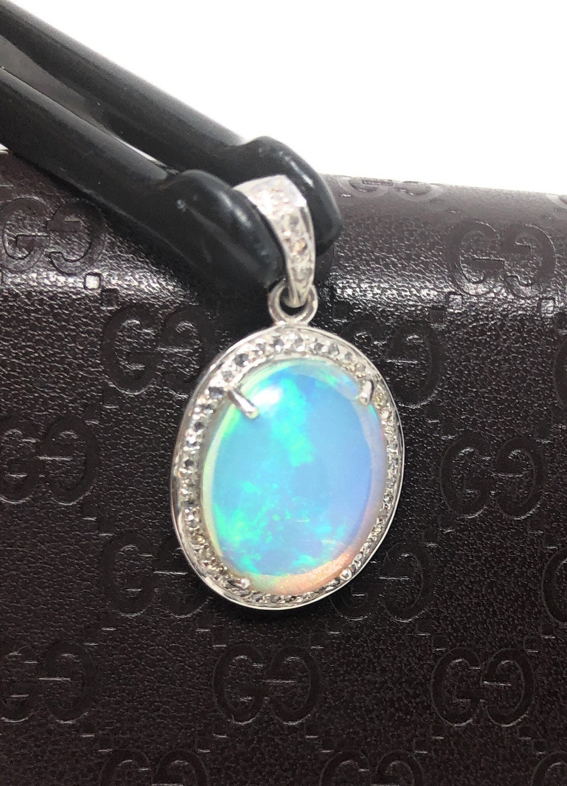 Ethiopian Opal Pendant, Gemstone Pendant, Diamond Pendant, Sterling Silver Opal Pendant, Pave Diamond Jewelry, Gifts for Her