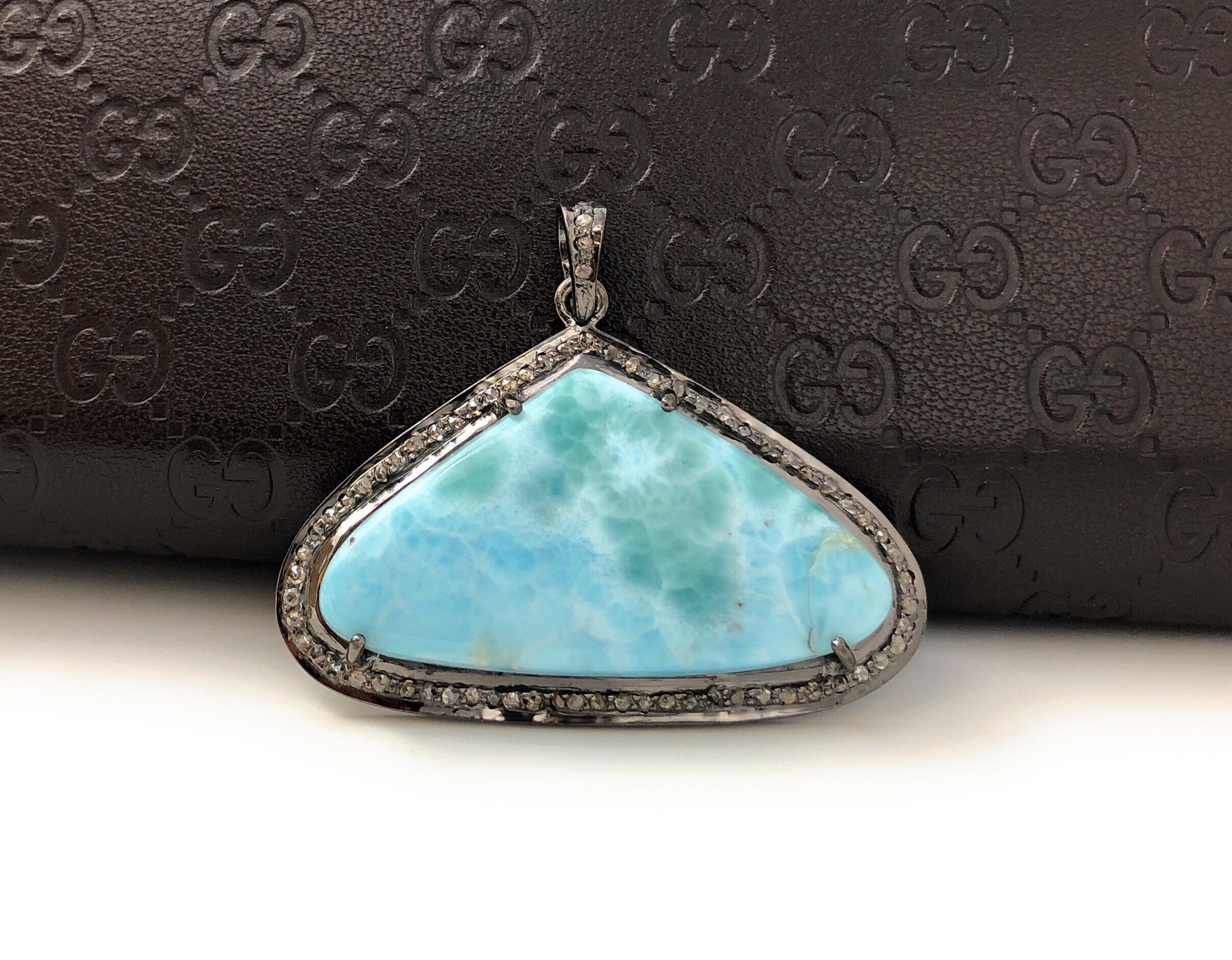 This beautiful Handmade AAA+ Grade Natural Larimar Gemstone Triangle Shape Oxidized 925 Sterling Silver Large Pave Diamond Bezel Setting Pendant is an excellent choice for any occasion and makes a great gift for the loved ones.