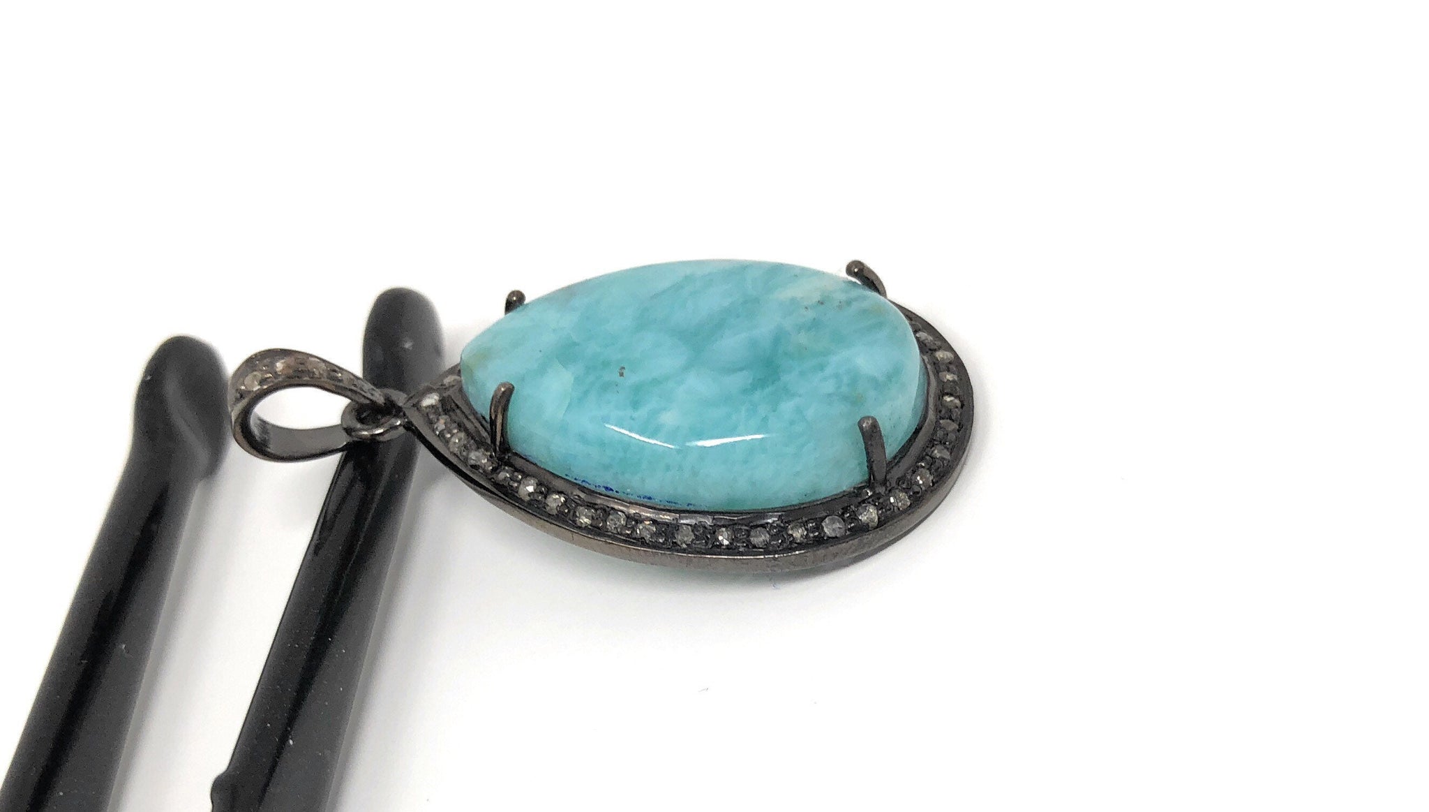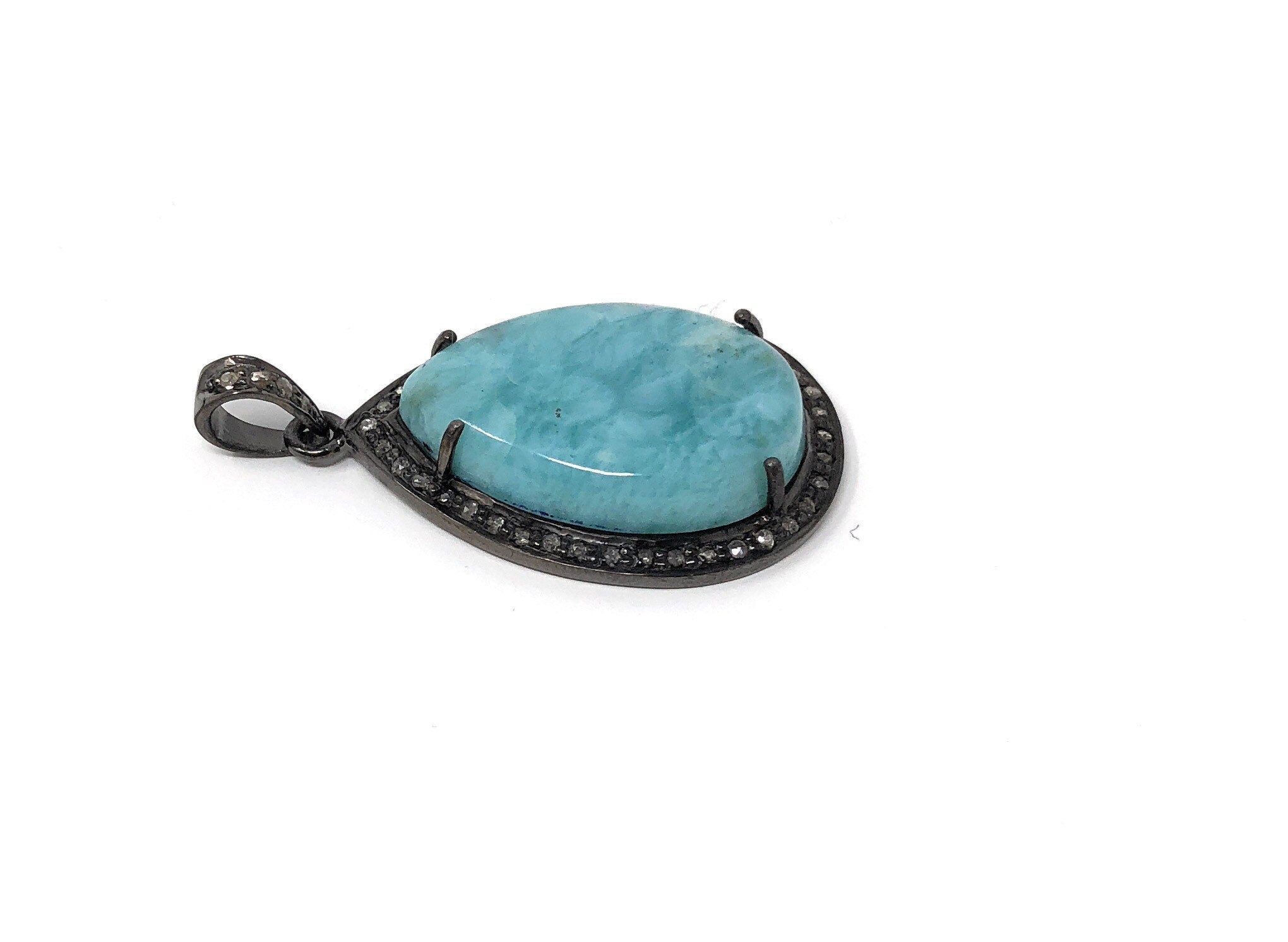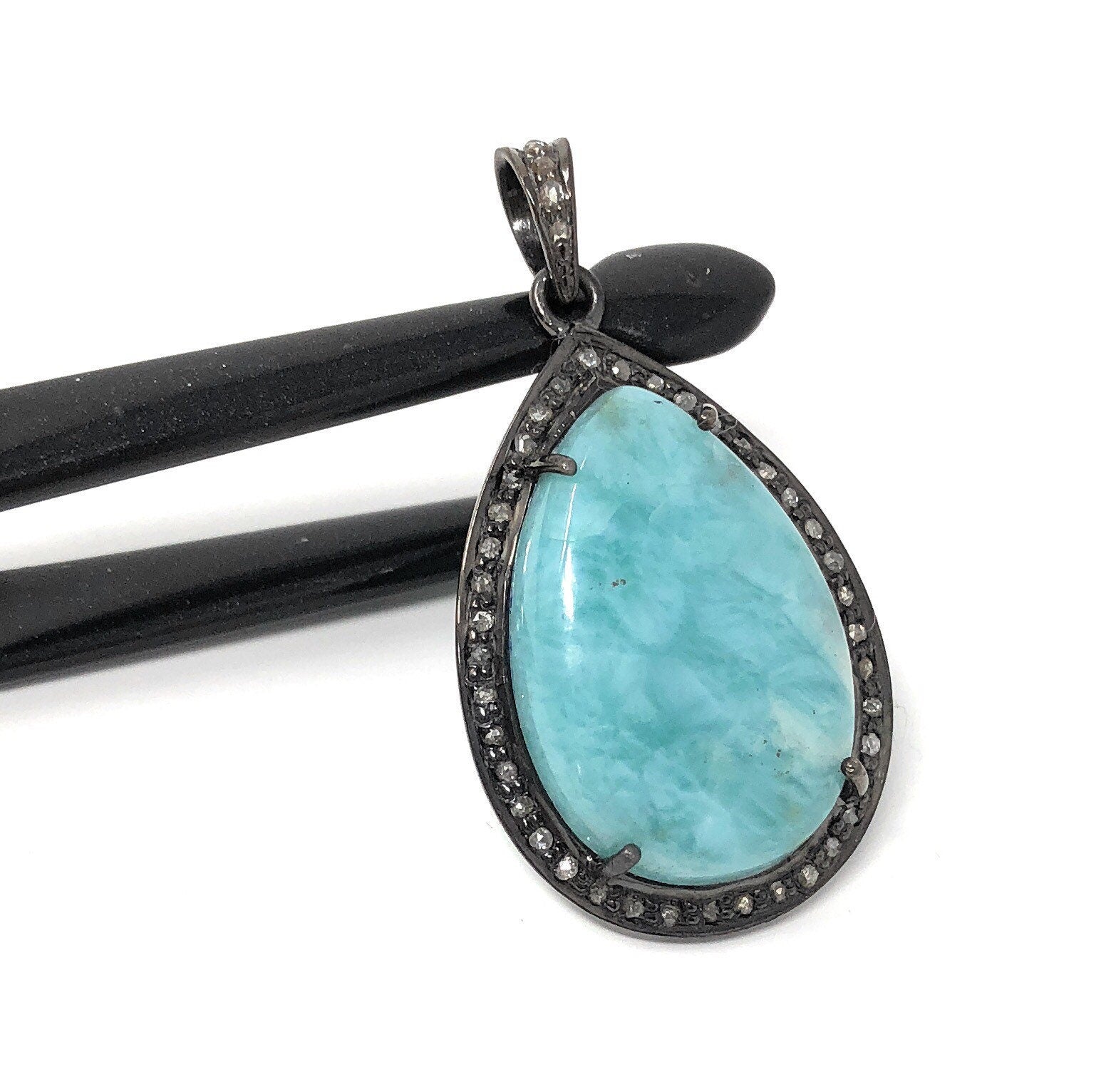 This beautiful Handmade AAA+ Grade Natural Larimar Gemstone Pear/Drop Shape Oxidized 925 Sterling Silver Large Pave Diamond Bezel Setting Bohemian Pendant is an excellent choice for any occasion and makes a great gift for the loved ones.