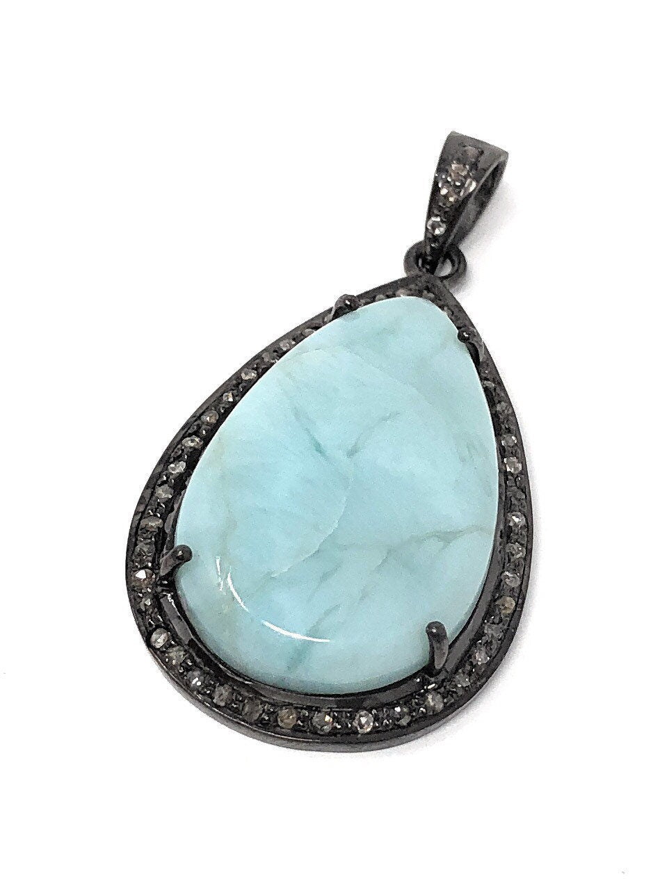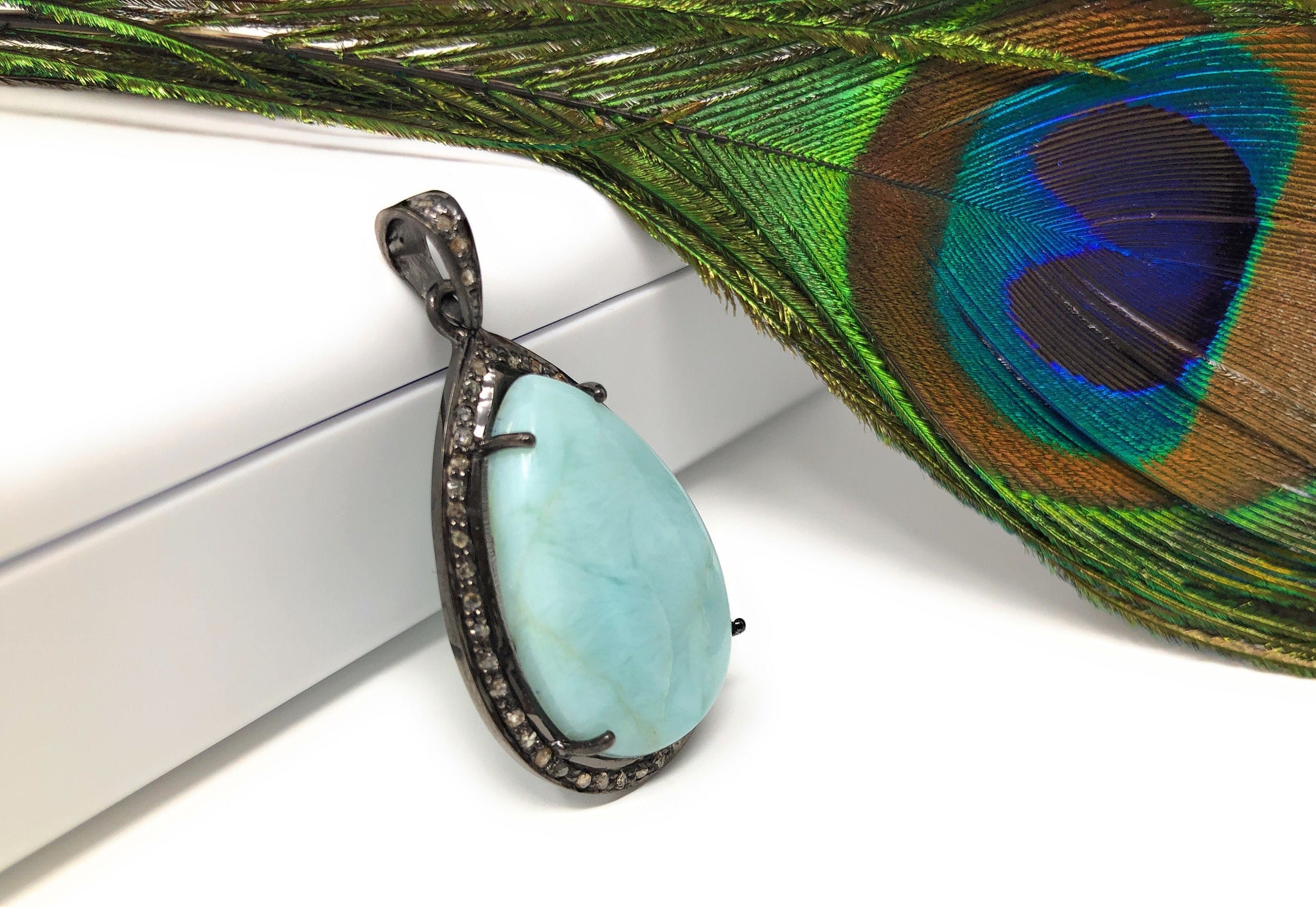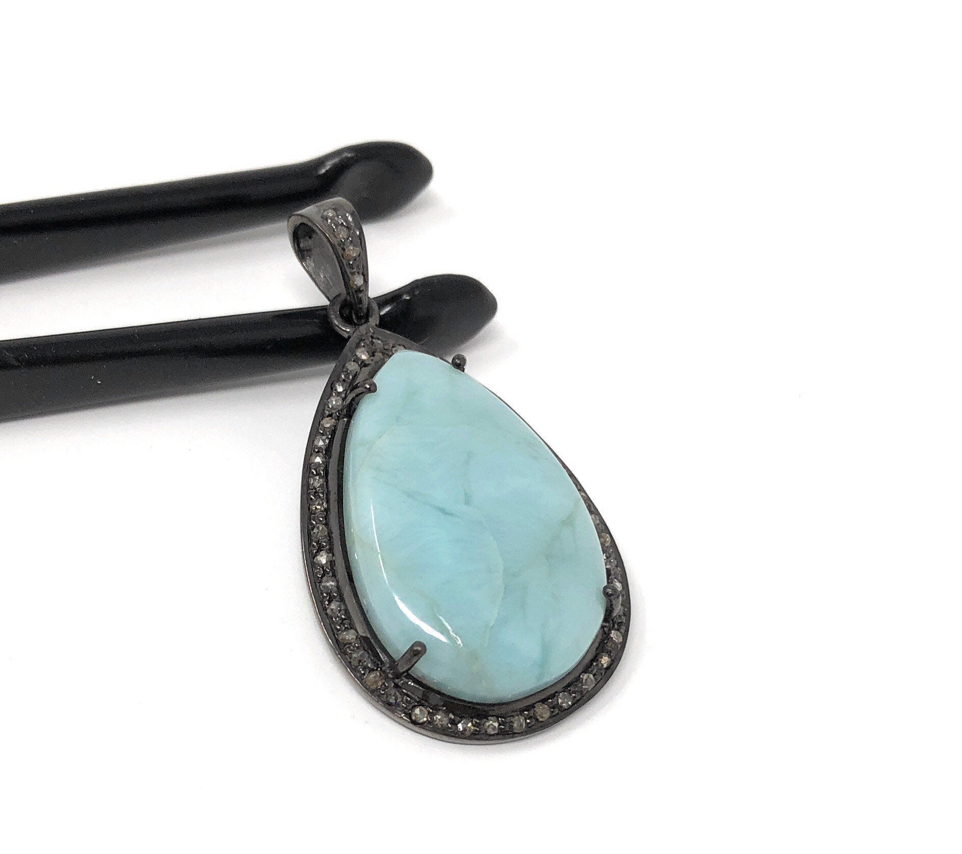 This beautiful Handmade AAA+ Grade Natural Larimar Gemstone Pear/Drop Shape Oxidized 925 Sterling Silver Large Pave Diamond Bezel Setting Pendant is an excellent choice for any occasion and makes a great gift for the loved ones.