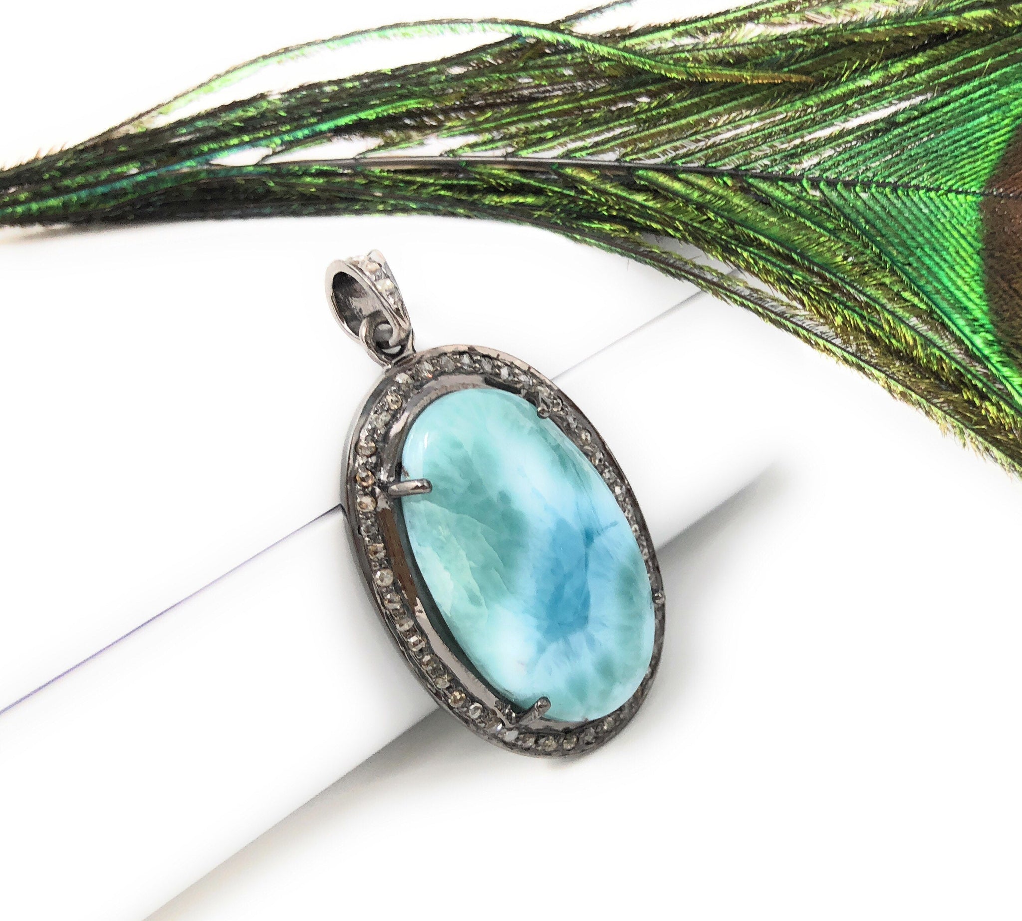 This beautiful Handmade AAA+ Grade Natural Larimar Gemstone Oval Shape Oxidized 925 Sterling Silver Large Pave Diamond Bezel Setting Pendant is an excellent choice for any occasion and makes a great gift for the loved ones.