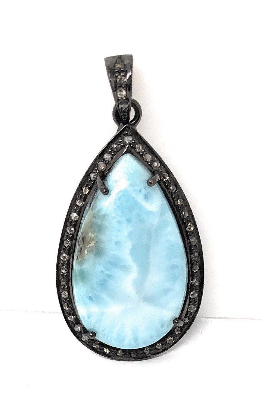 This beautiful Handmade AAA+ Grade Natural Larimar Gemstone Pear/Drop Shape Oxidized 925 Sterling Silver Large Pave Diamond Bezel Setting Pendant is an excellent choice for any occasion and makes a great gift for the loved ones.