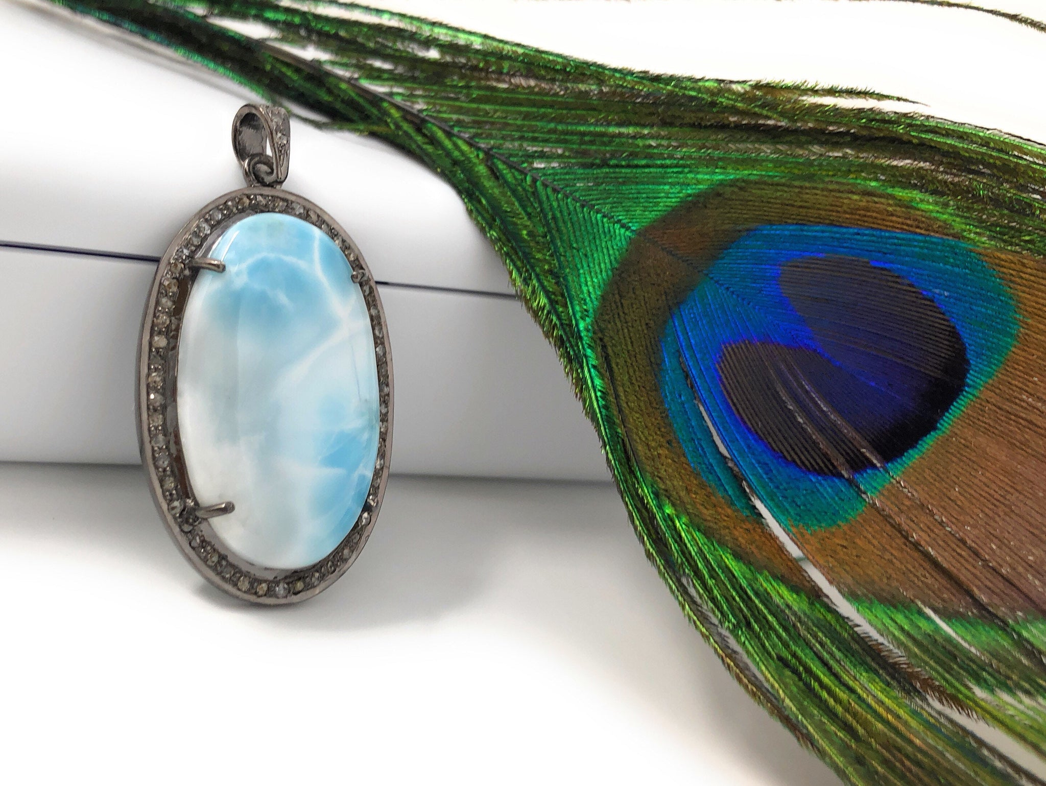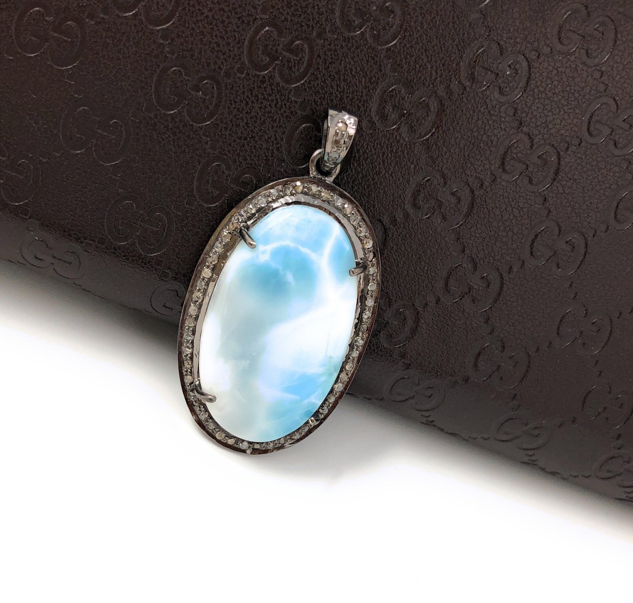 This beautiful Handmade AAA+ Grade Natural Larimar Gemstone Oval Shape Oxidized 925 Sterling Silver Large Pave Diamond Bezel Setting Pendant is an excellent choice for any occasion and makes a great gift for the loved ones.