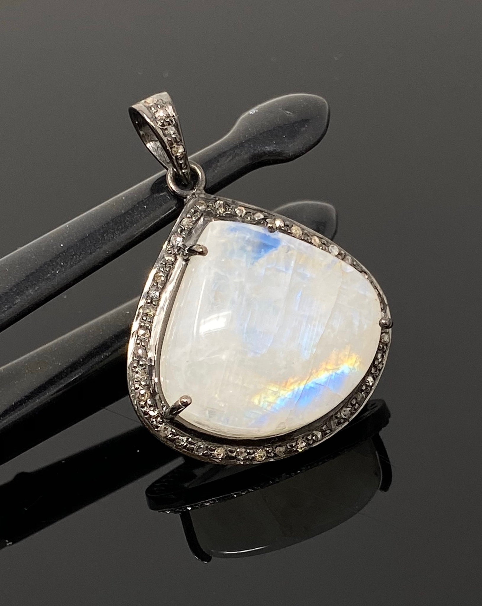 Rainbow Moonstone Gemstone Pave Diamond Oxidized Sterling Silver Exclusive Pendant at Wholesale Price.