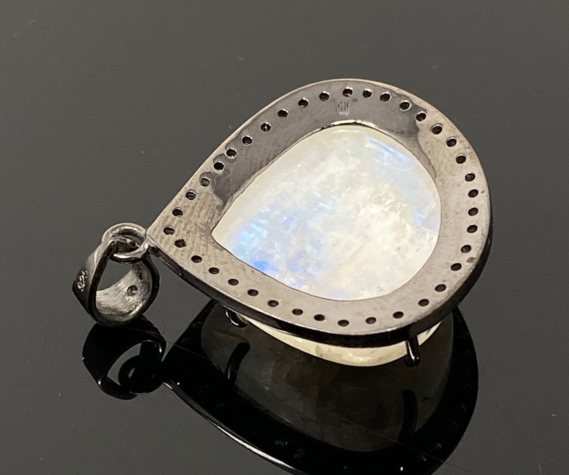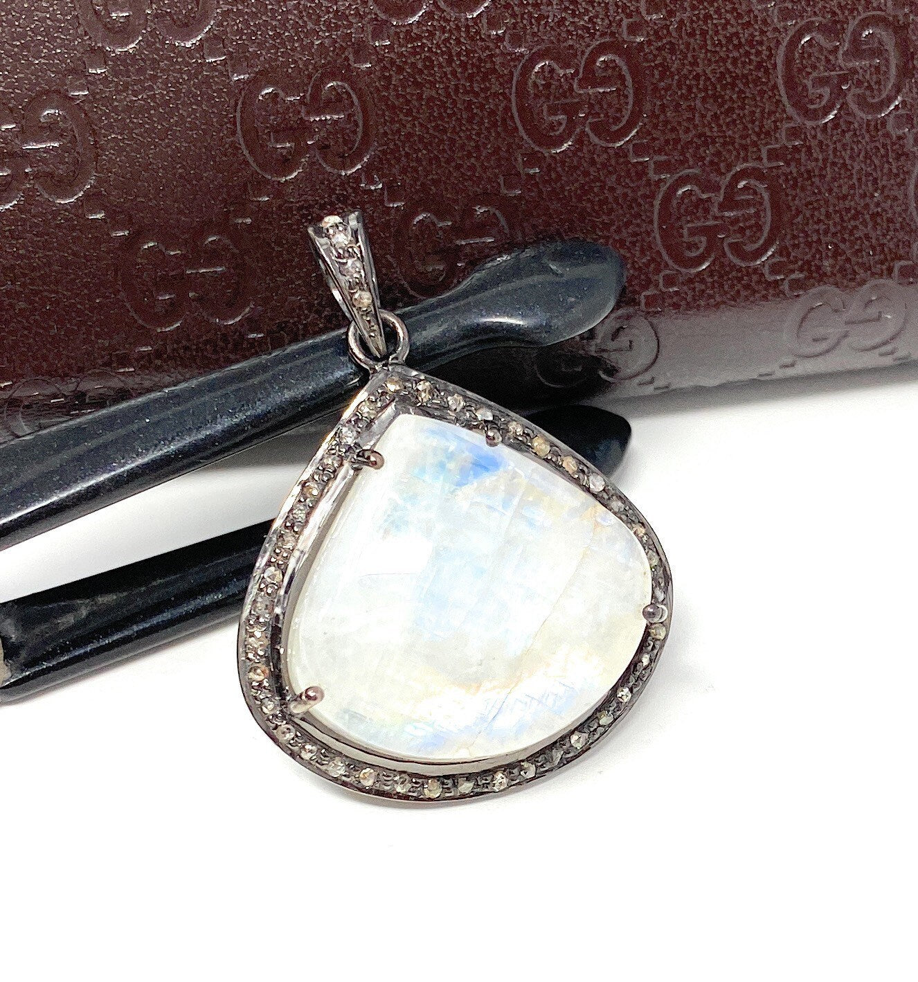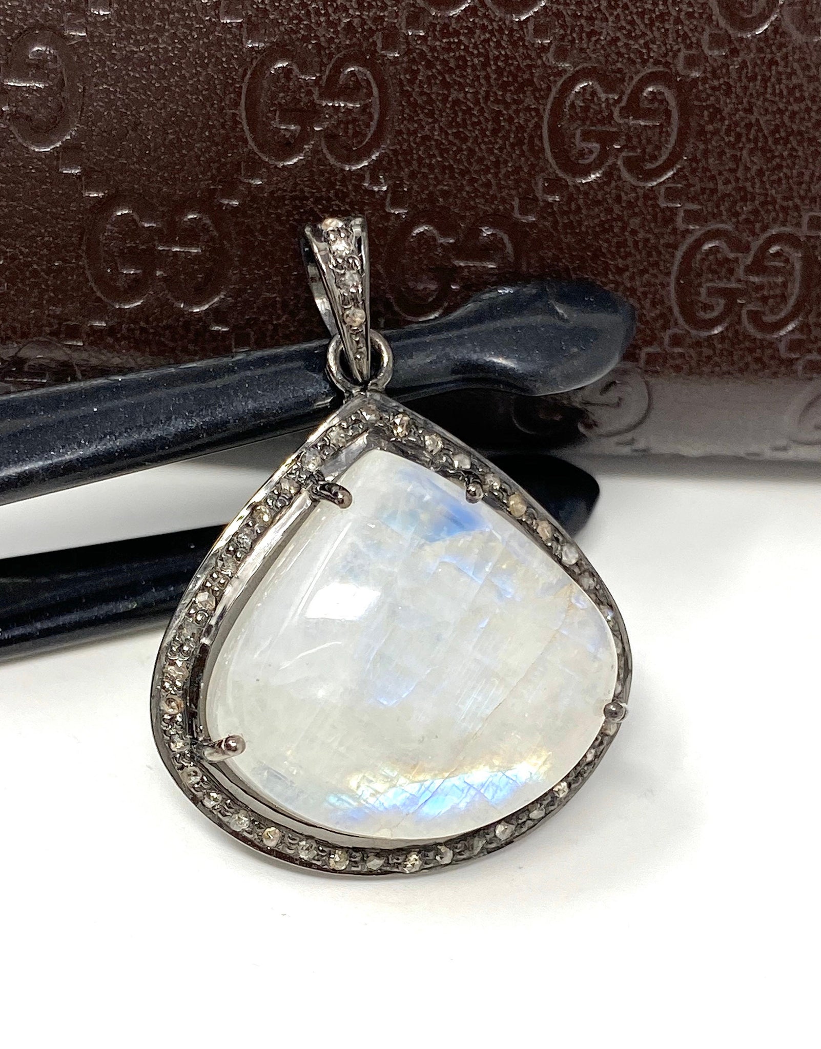 This exclusive beautiful Handmade AAA+ Grade Large Natural Rainbow Moonstone Gemstone Drop Shape Oxidized 925 Sterling Silver Pave Diamond Bezel Setting Pendant is an excellent choice for any occasion and makes a great gift for the loved ones.