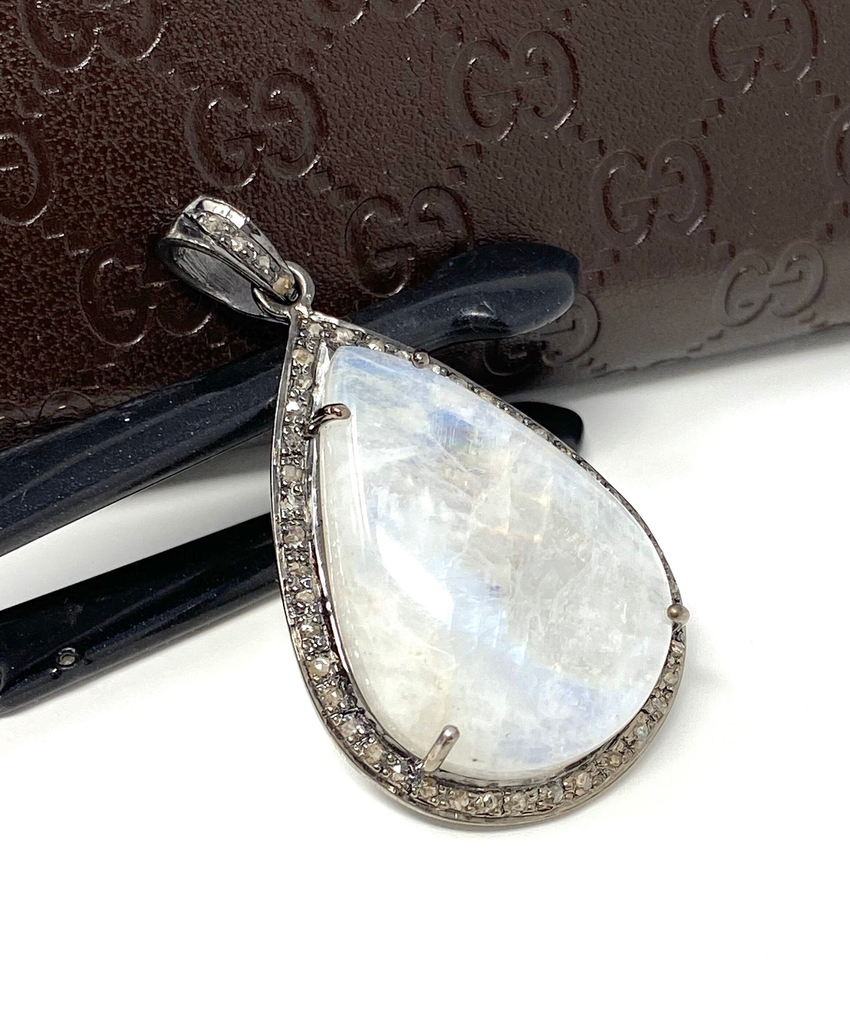 This exclusive beautiful Handmade AAA+ Grade Large Natural Rainbow Moonstone Gemstone Drop Shape Oxidized 925 Sterling Silver Pave Diamond Bezel Setting Pendant is an excellent choice for any occasion and makes a great gift for the loved ones.