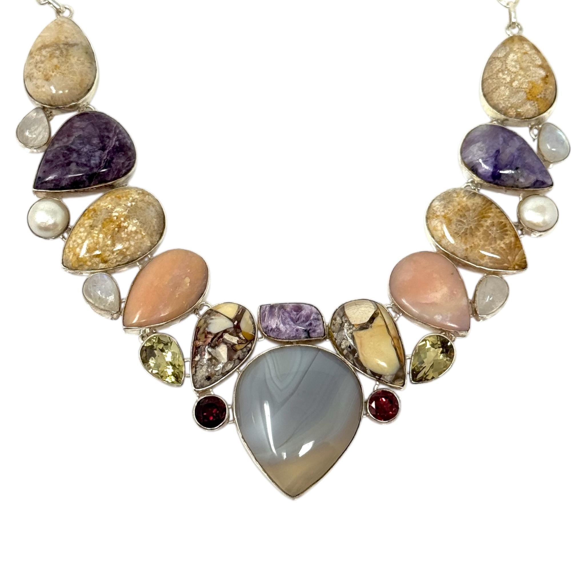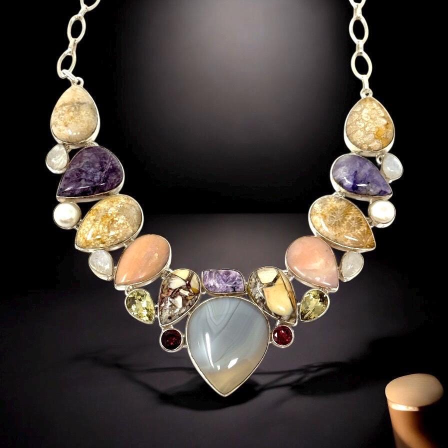 • Handcrafted with a mesmerizing blend of Charoite, Agate, Garnet, Pink Opal, Fresh Water Pearl, and Peridot