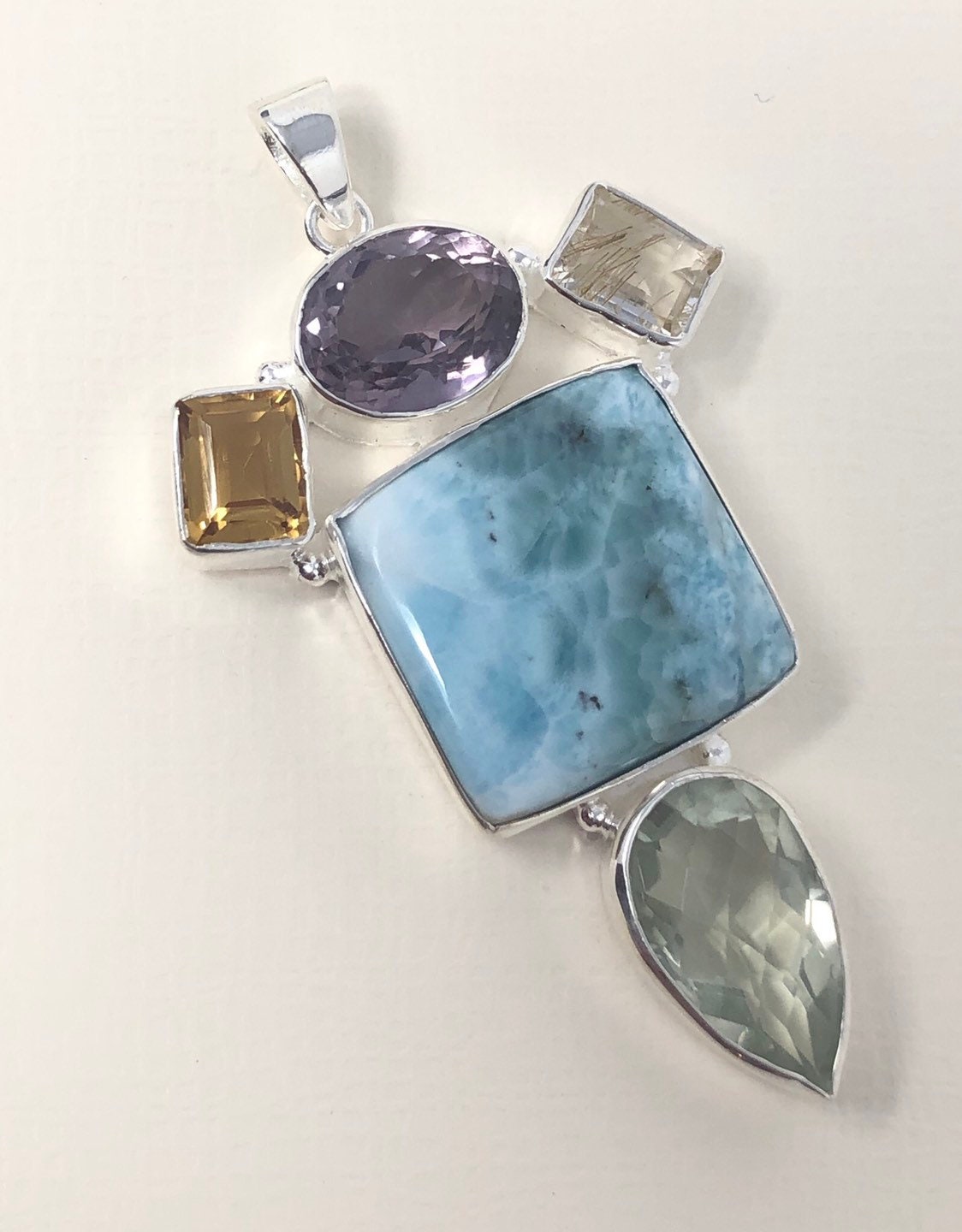 This Beautiful Handmade 925 Sterling Silver Designer Large Pendant is made with using Smooth Larimar Cabochon, Cut Stone Citrine, Golden Rutile, Purple and Green Amethyst and is an excellent choice for any occasion and makes a great gift for the loved ones.
