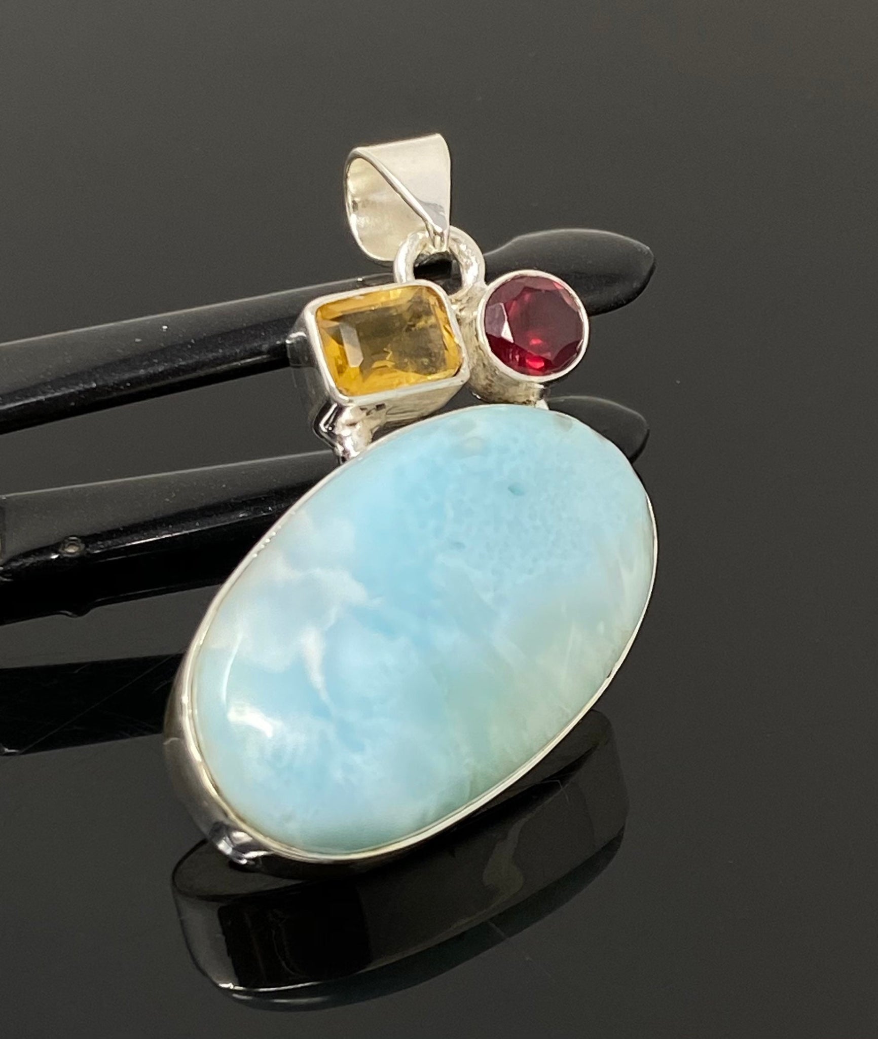 Natural Larimar with Garnet and Citrine Gemstone Pendant, Sterling Silver Jewelry, Larimar Pendant, Citrine Pendant, Bohemian Jewelry