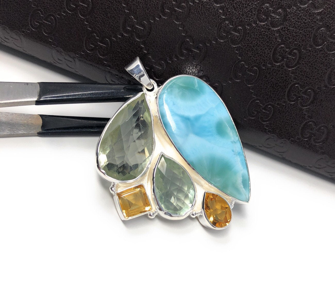 This Beautiful Handmade 925 Sterling Silver Designer Large Pendant is made with using Smooth Larimar Cabochon, Cut Stone Citrine and Green Amethyst and is an excellent choice for any occasion and makes a great gift for the loved ones.