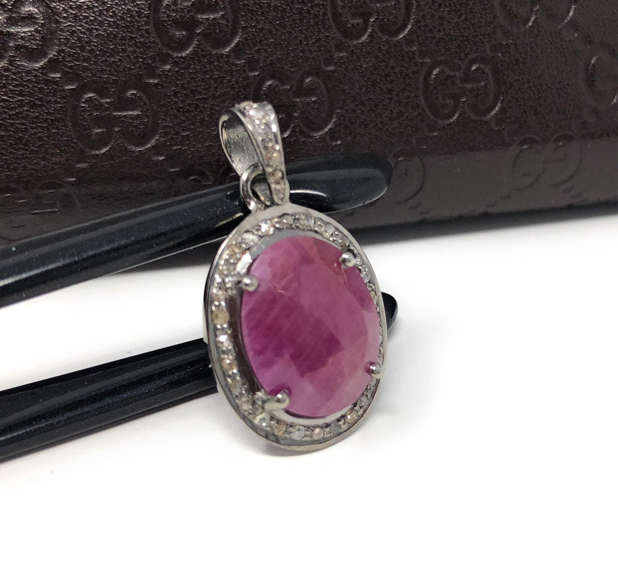 Sterling Silver Natural Gemstone Pink Sapphire Pave Diamond Pendant