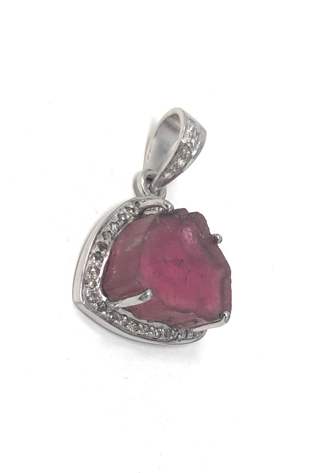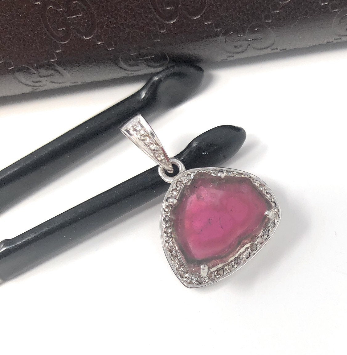 Sterling Silver Natural Watermelon Tourmaline Slice Pave Diamond Pendant at Wholesale Price .