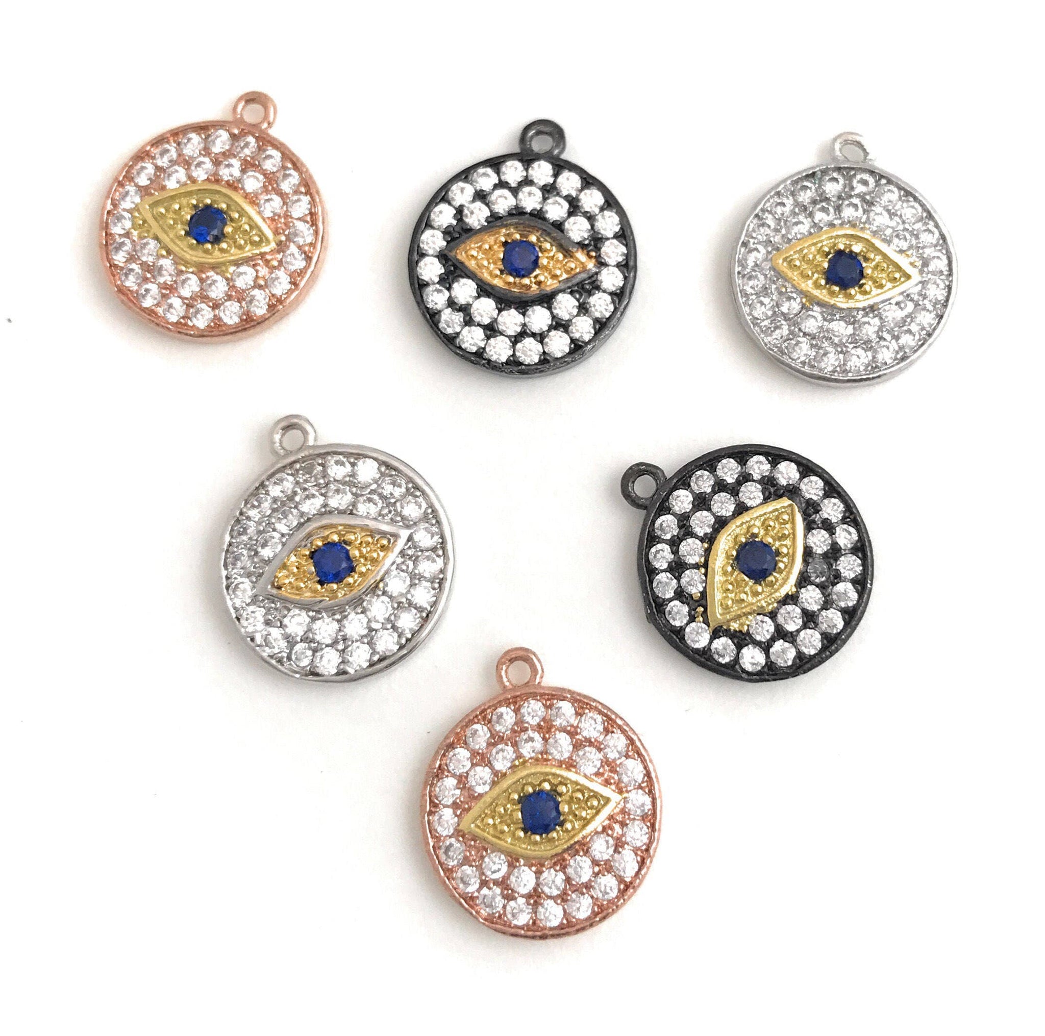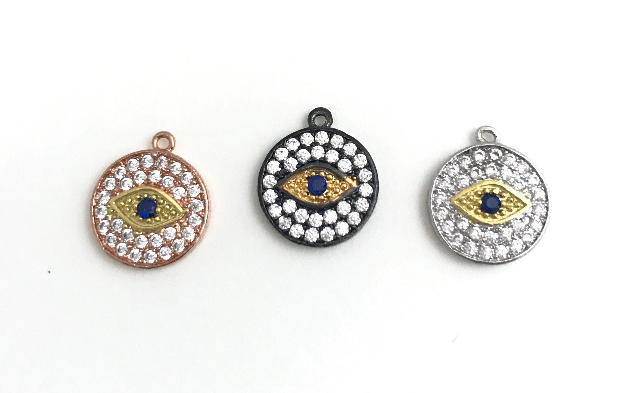 Evil Eye Pave Disc Charm CZ Micro Pave Round Shape for Jewelry Making at Wholesale Price available in Platinum Plated, Gold Plated, Rose Gold Plated and Gun Metal Plated.