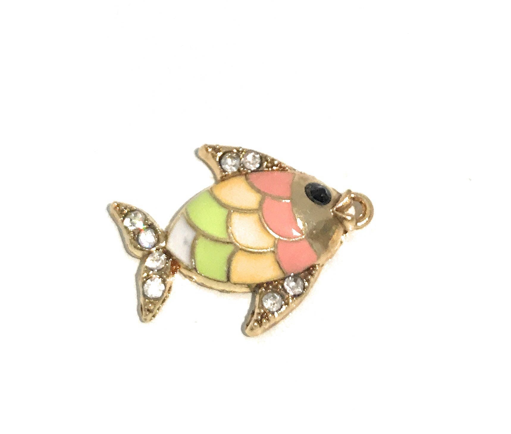 Fish represents wealth, courage, abundance, regeneration, harmony, fidelity and happiness. This Beautiful Gold Plated Fish Charm Pendant in Multi color Enamel and Clear Rhinestones is an excellent choice for making Bangle Bracelet, Charm Bracelet, Pendant Necklace or a pair of Dangle Earrings.