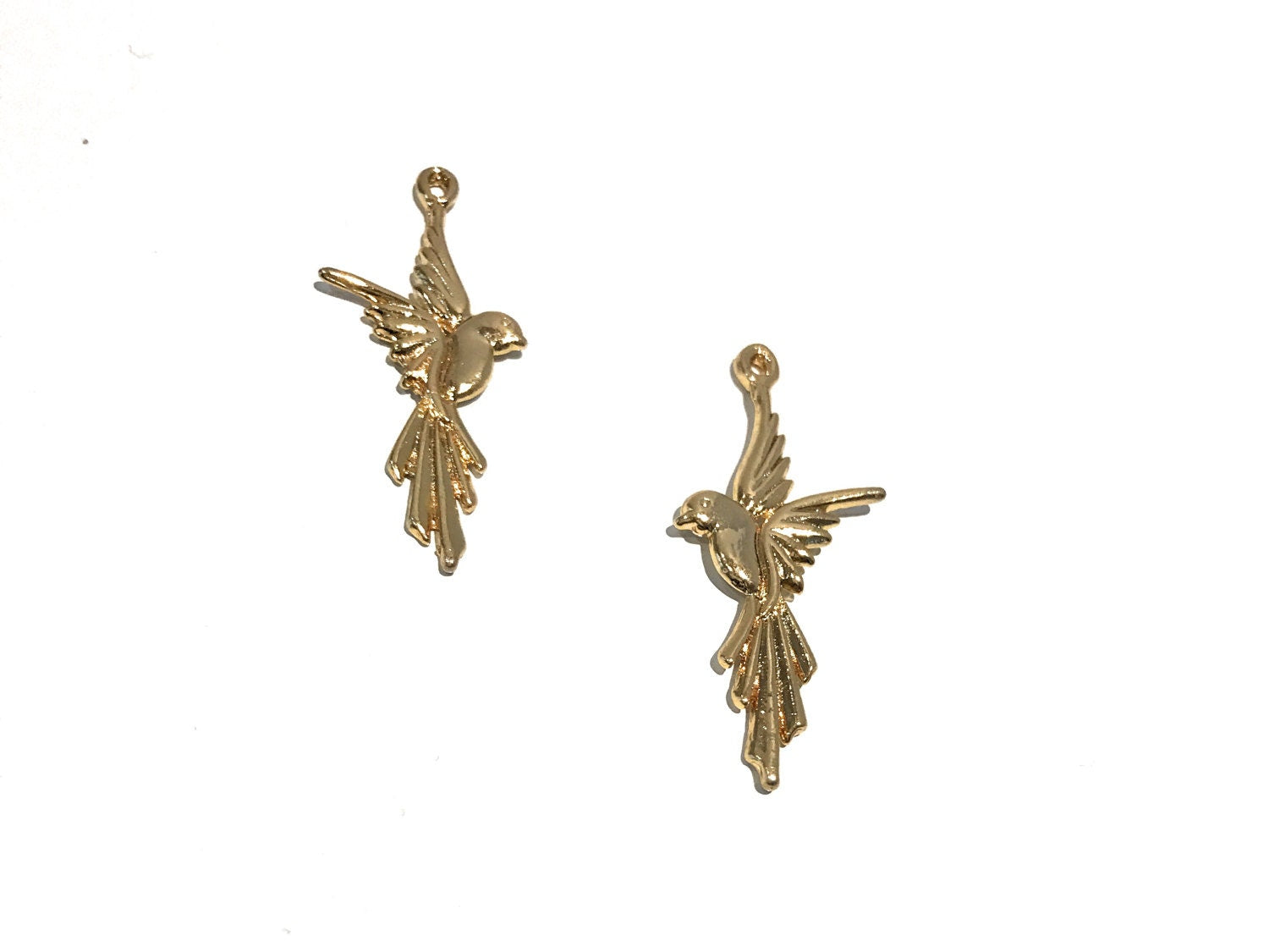 These Beautiful 24K Gold Plated Flying Bird Charms are exclusive and are hard to find in pairs as 2 Pieces in the pair face each other. These are an excellent choice for making Beautiful Earrings or Pendant Necklaces.