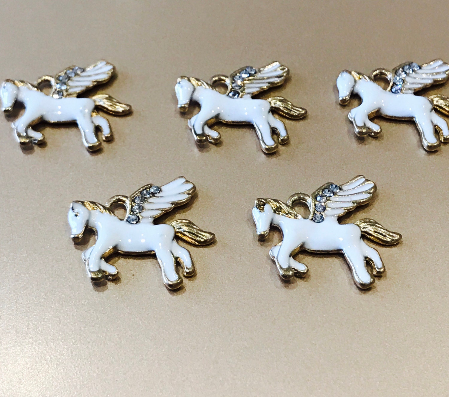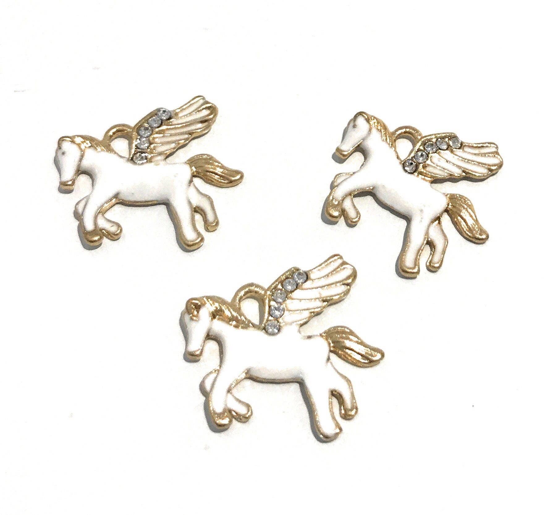 Gold Plated Pegasus with Wing Carved Clear Rhinestone White Enamel Charm for Jewelry Making.