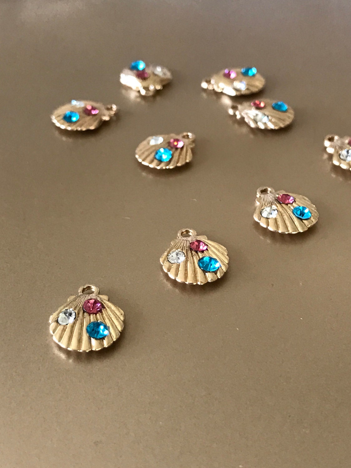 Gold Plated Seashell Charm with Multi Color Rhinestones for Jewelry Making.