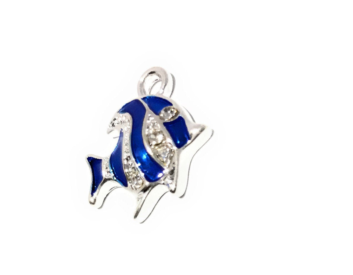 This Beautiful Silver Plated Fish Charm is set with Clear Rhinestones and Blue Enamel.