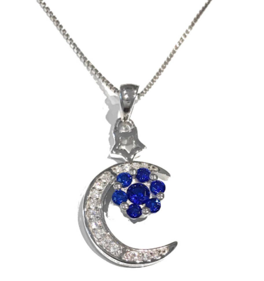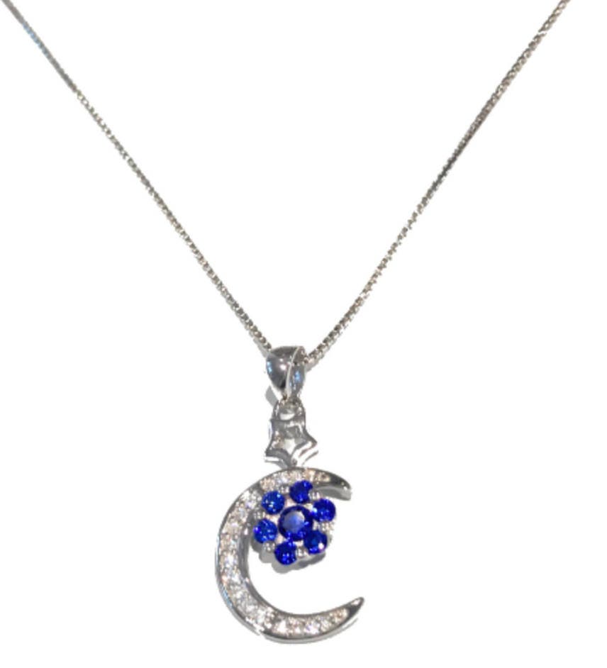925 Silver stamped Moon with Blue CZ Flower Pendant with 925 silver stamped Italian Box Chain