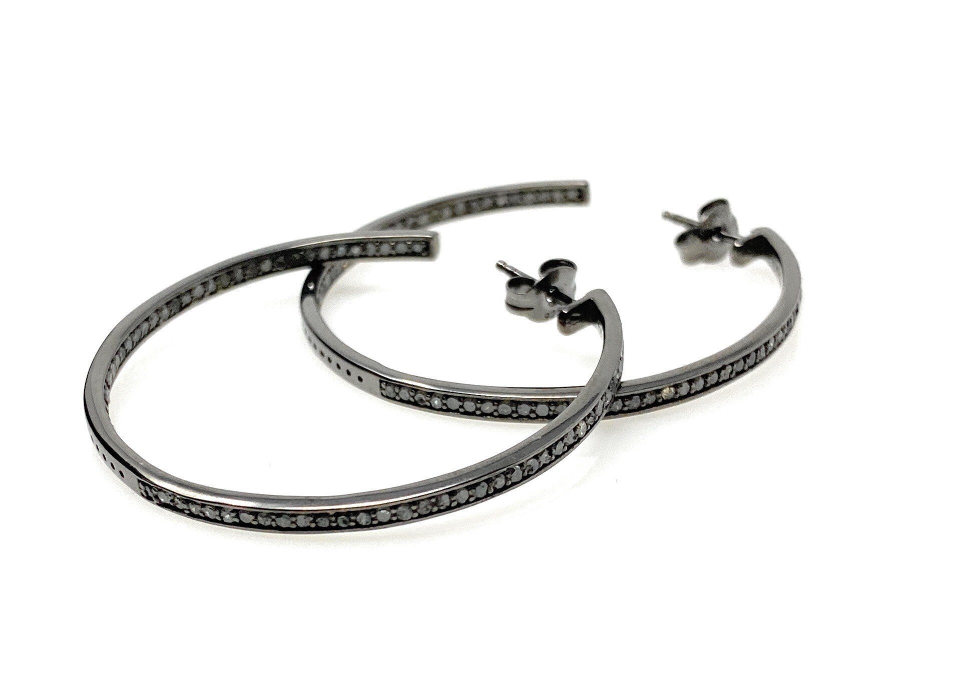 55mm Oxidized Sterling Silver Pave Diamond Hoop Earrings.