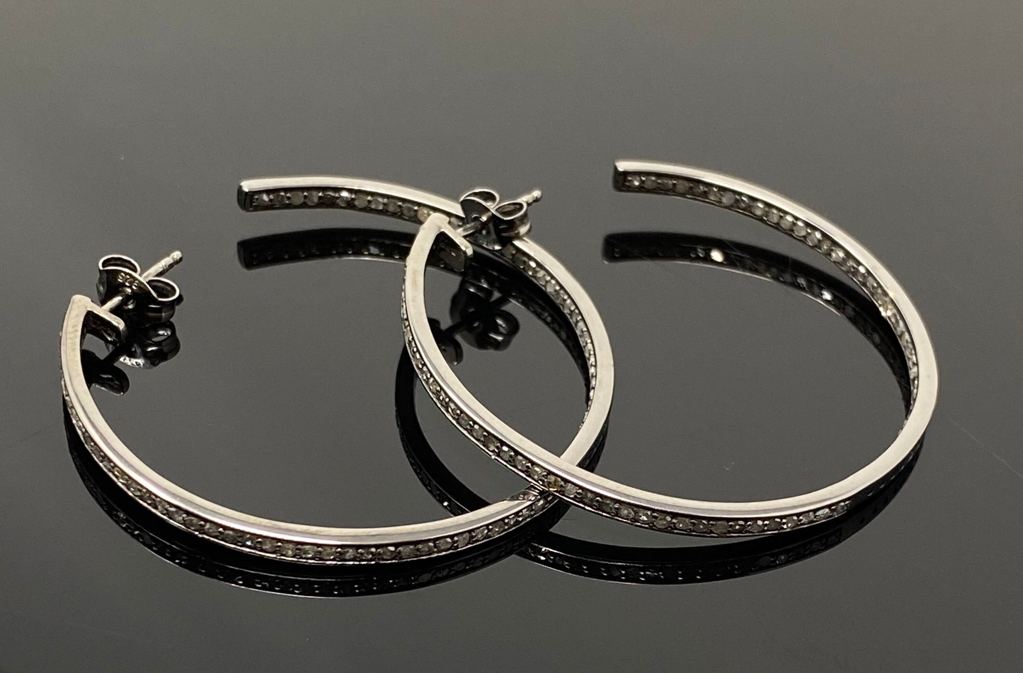 55mm Diamond Hoop Earrings, Oxidized Sterling Silver Pave Diamond Earrings, Silver Hoop Earrings