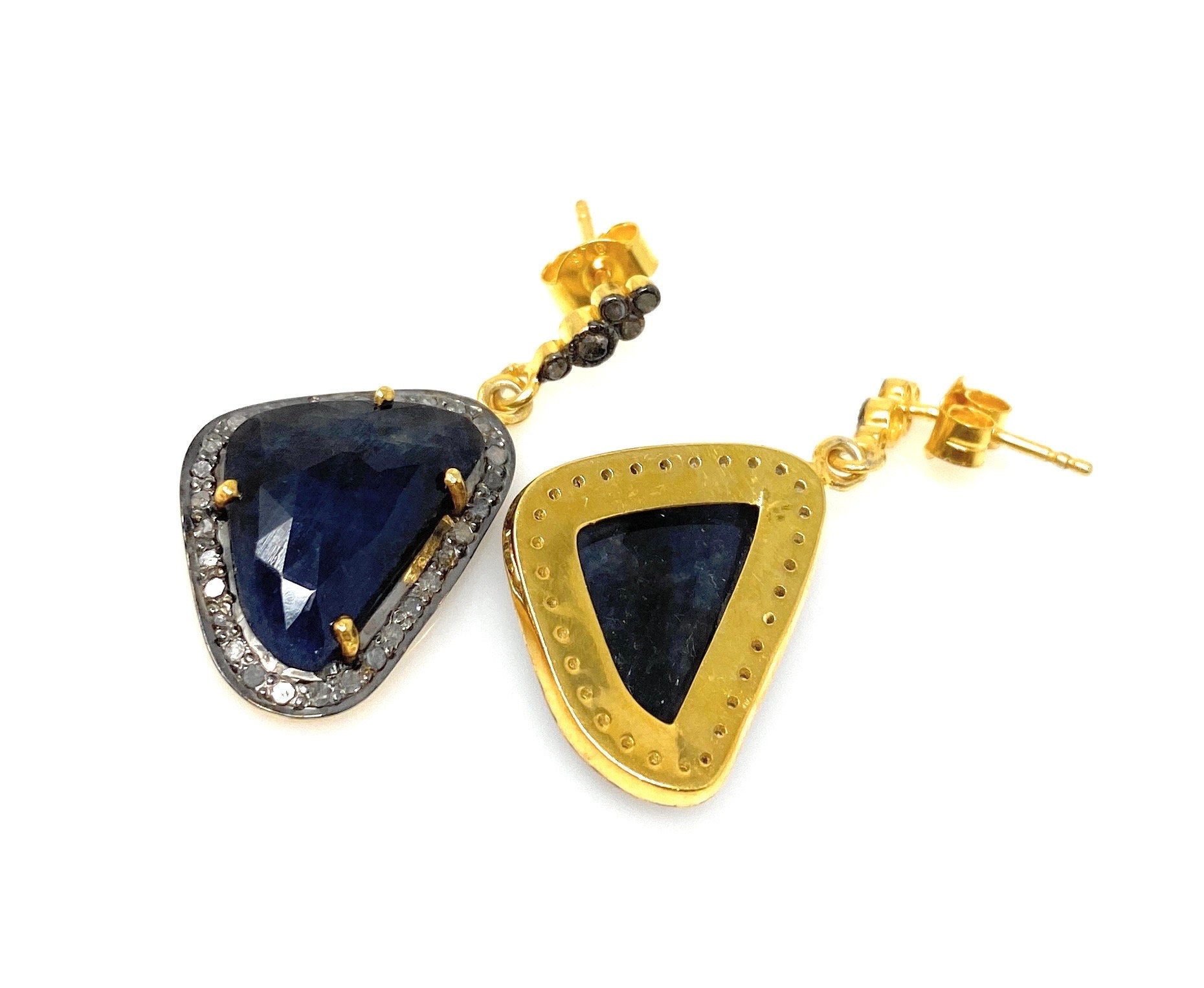 Designed to empower the wearer, these earrings makes the perfect gift for anyone on a journey of self-discovery and spiritual growth. Wear it as a reminder to trust your intuition and tap into your highest potential. The blue sapphire's calming influence can help quiet the mind, allowing you to access your inner wisdom with clarity and focus. These beautiful Rose Cut Blue Sapphire Earrings are handmade with meticulous care using genuine diamonds and Natural Sapphire bezel set in Sterling Silver and Black Rhuthenium over Silver around Diamonds and 14K Gold Plated over Silver.
