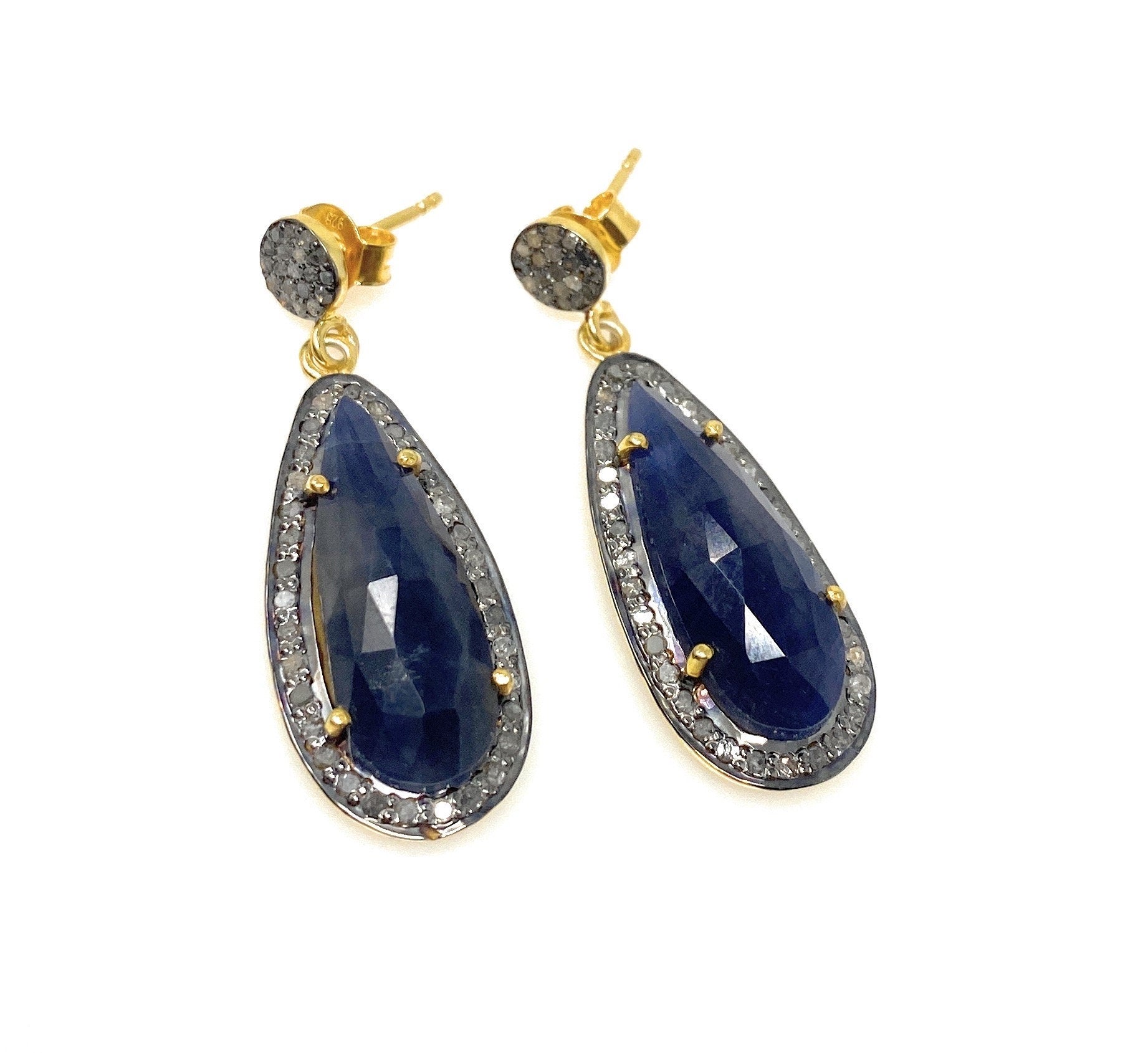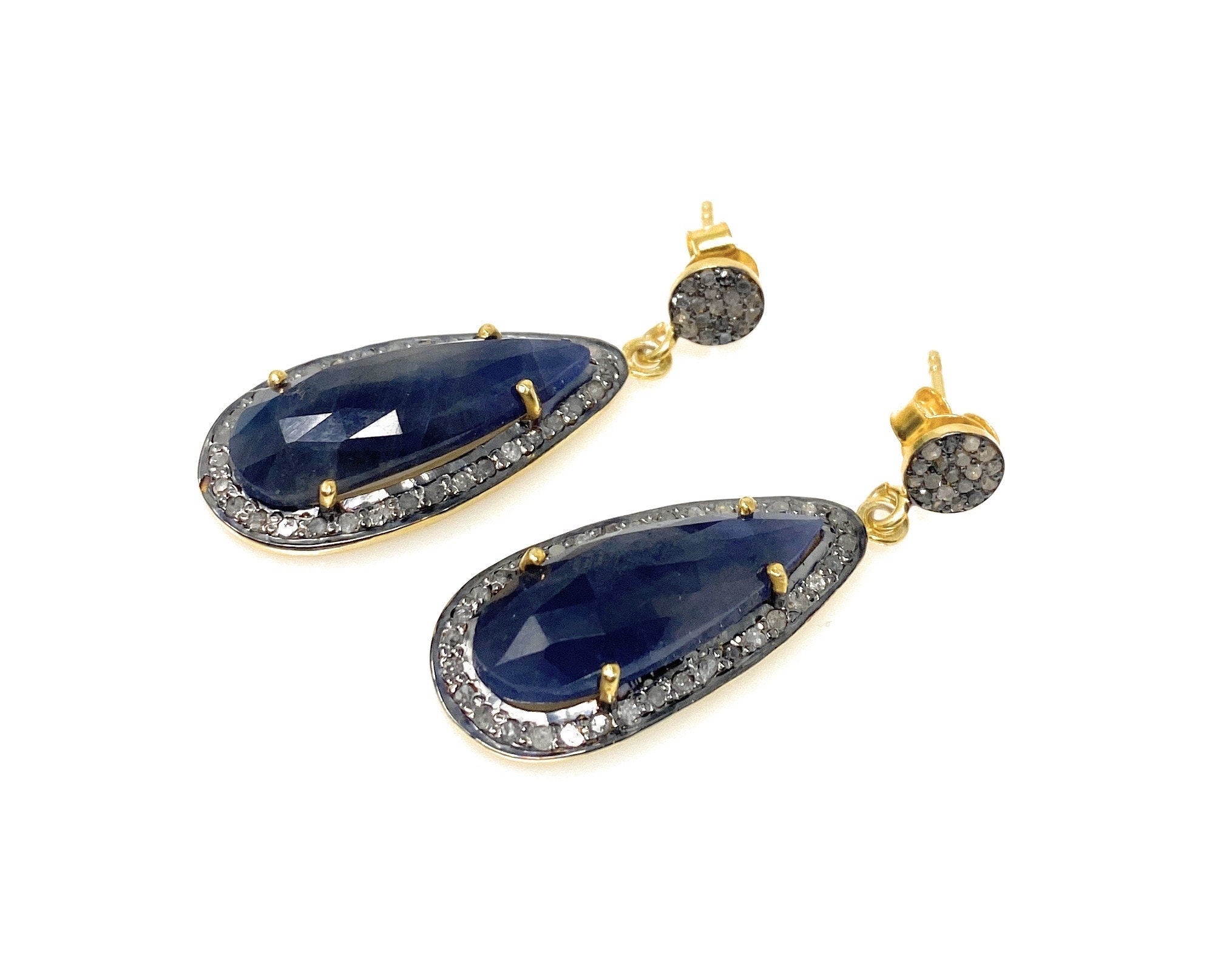 These beautiful Rose Cut Blue Sapphire Earrings are handmade with meticulous care using genuine diamonds and Natural Sapphire bezel set in Sterling Silver and Black Rhuthenium over Silver around Diamonds and 14K Gold Plated over Silver.