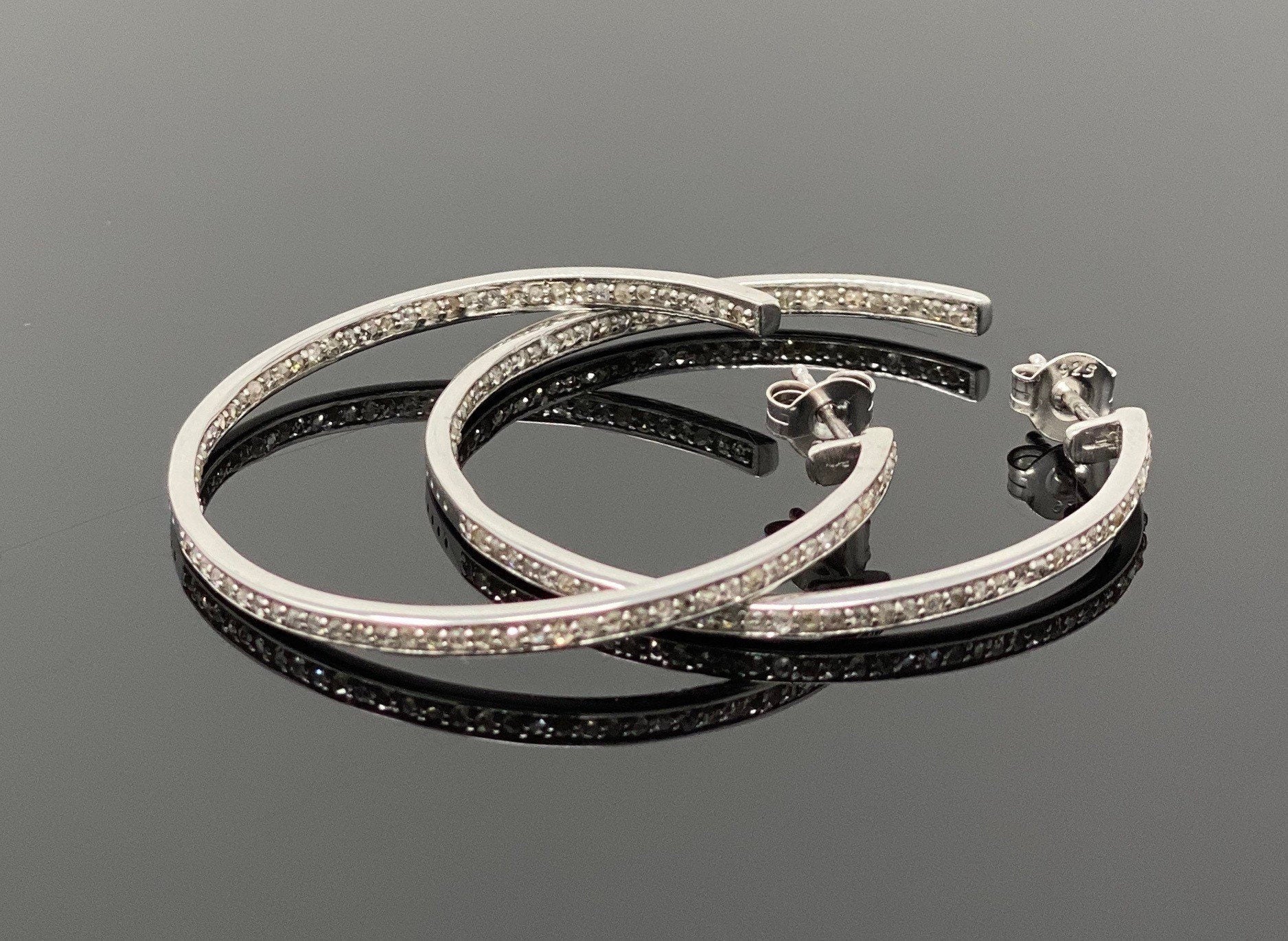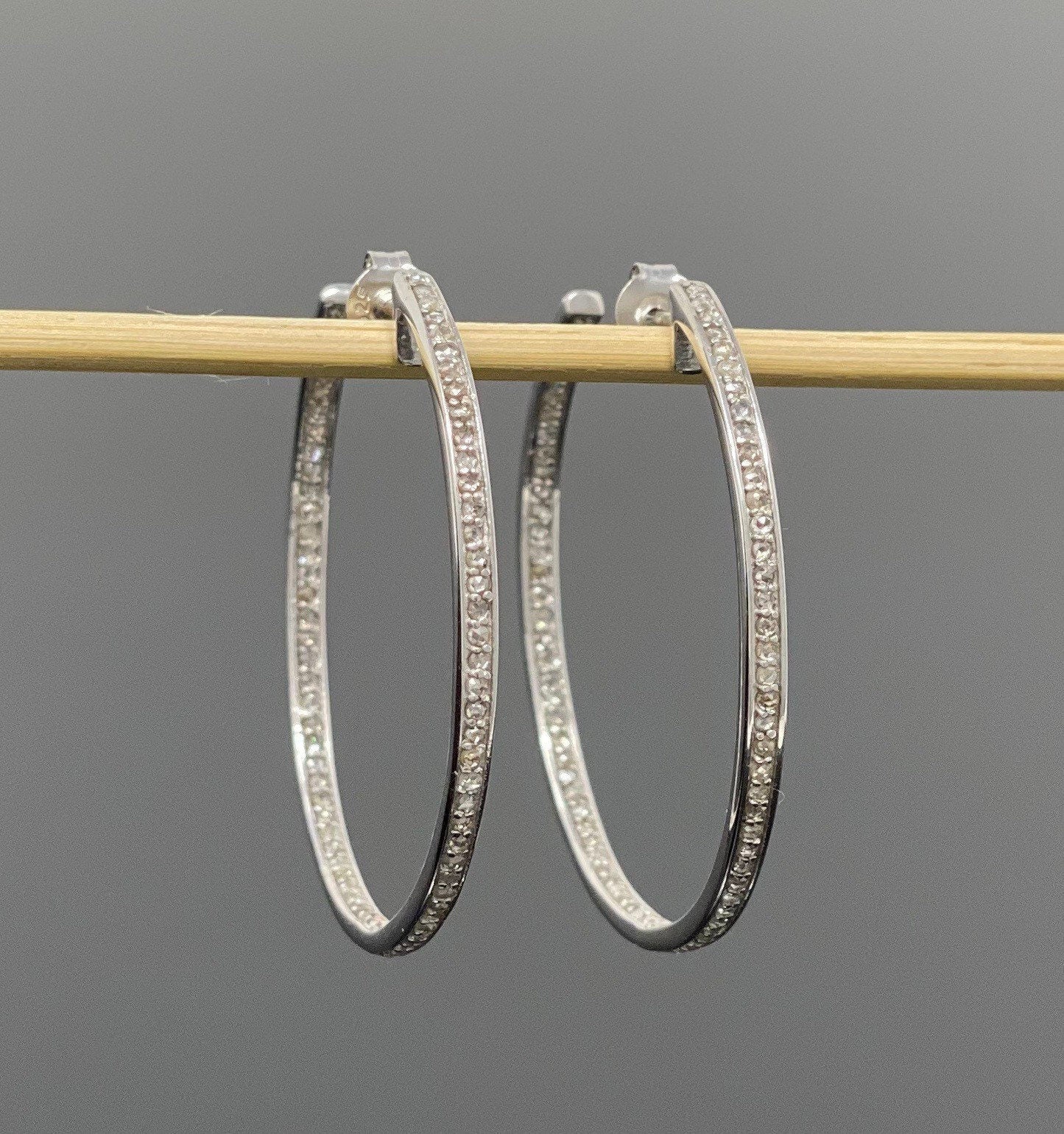 Diamond Hoop Earrings, Sterling Silver Pave Diamond Earrings, Silver Hoop Earrings