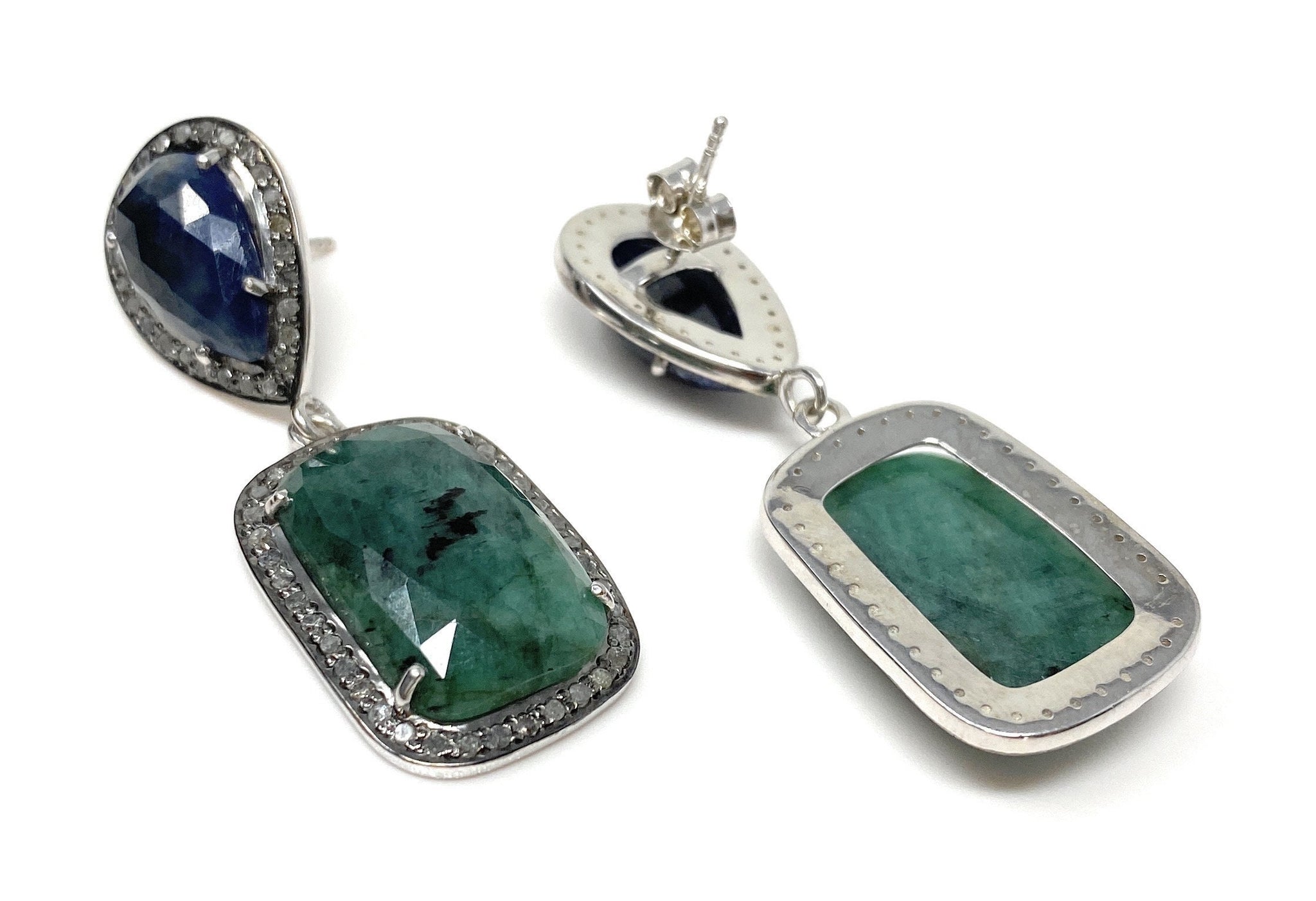 Genuine Emerald and Blue Sapphire Pave Diamond Earrings, Sapphire Earrings, Emerald Earrings, Gifts for Her