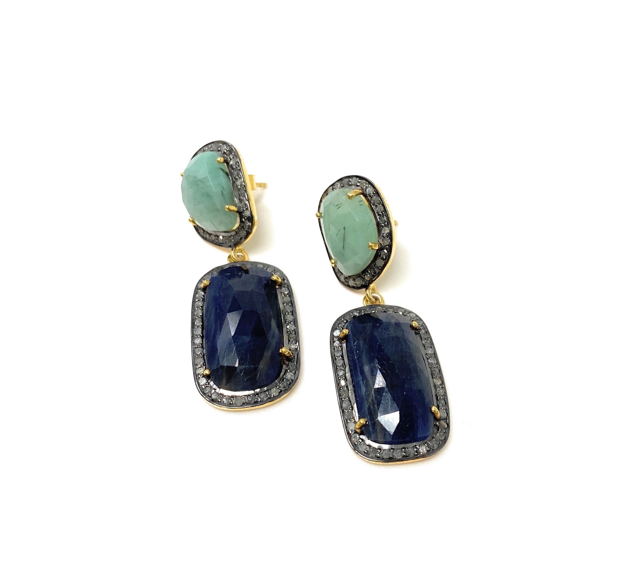 These beautiful Emerald and Sapphire Earrings are handmade with meticulous care using genuine diamonds and Natural Gemstones bezel set in Black Rhuthenium over Sterling Silver in front and 14K Gold Plated on the back side.