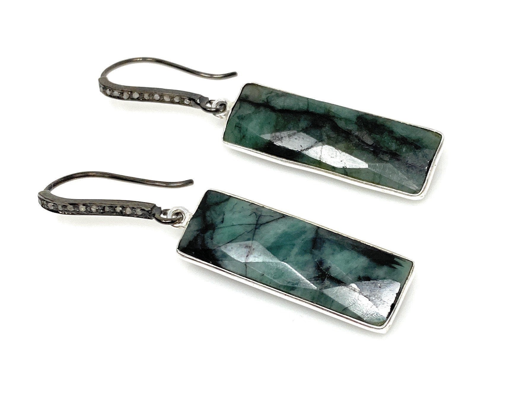 Genuine Emerald Bar Earrings, Pave Diamond Earrings, Sterling Silver Gemstone Bar Earrings, Gifts for Her
