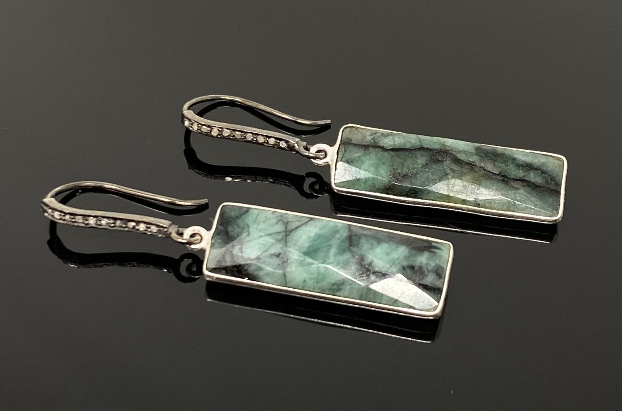 These beautiful Earrings are made with meticulous care using genuine diamonds on Black Rhodium Sterling Silver ear wires and AAA Grade Natural Genuine Emerald bezel set in Sterling Silver.