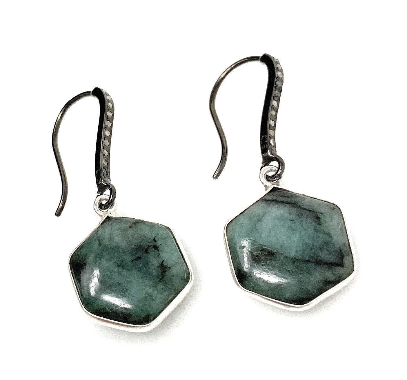 These beautiful Earrings are made with meticulous care using genuine diamonds on Black Rhodium Sterling Silver Ear Wires and Smooth Emerald bezel set in Sterling Silver.