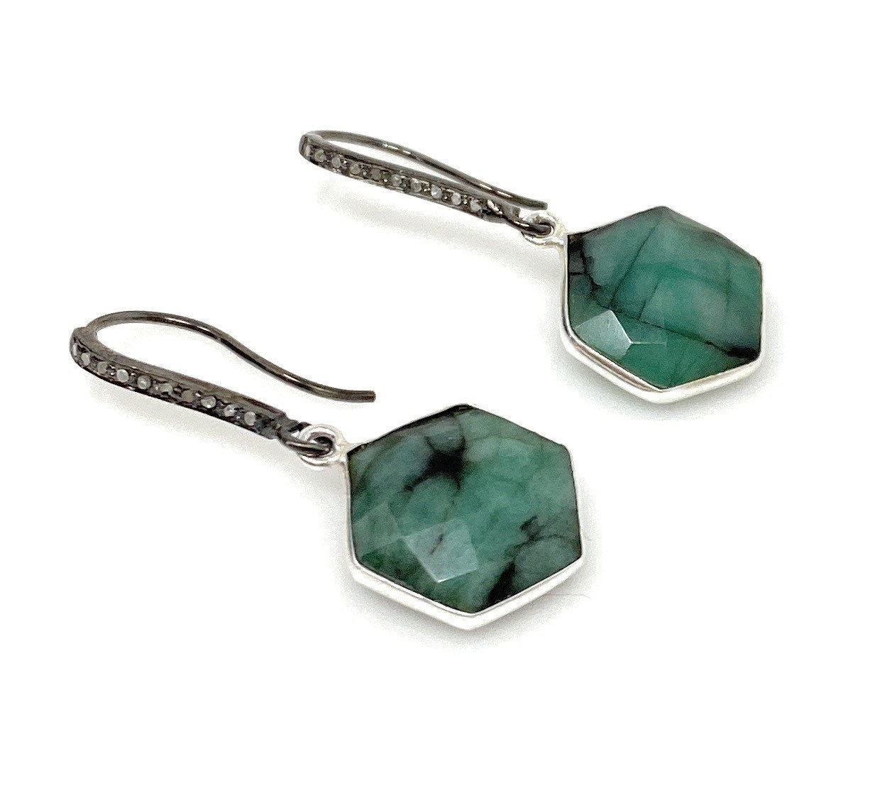 These beautiful Earrings are made with meticulous care using genuine diamonds on Black Rhodium Sterling Silver Ear Wires and Faceted Emerald bezel set in Sterling Silver.