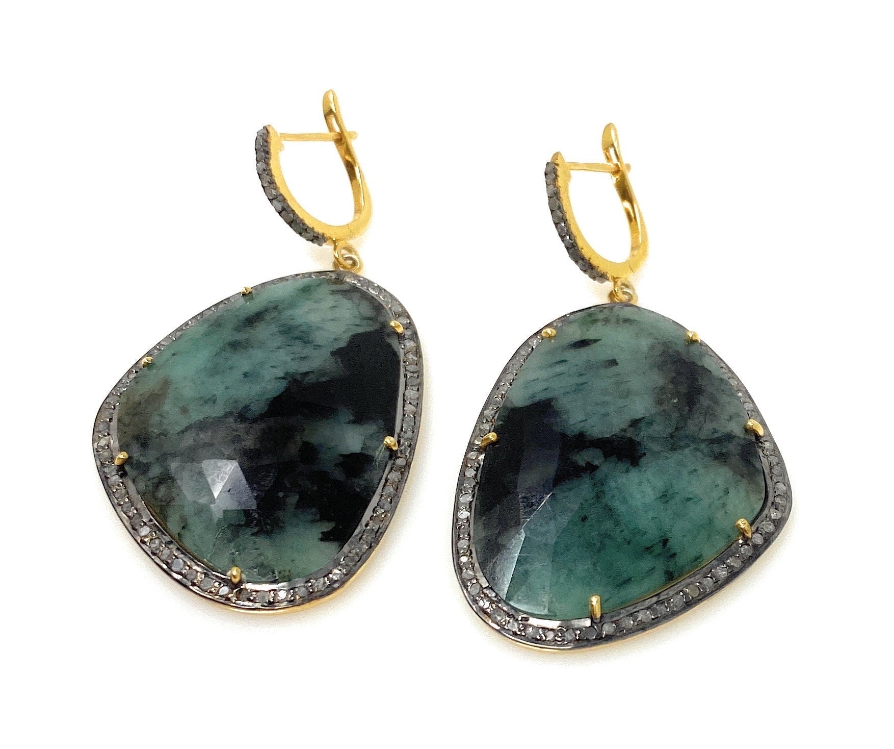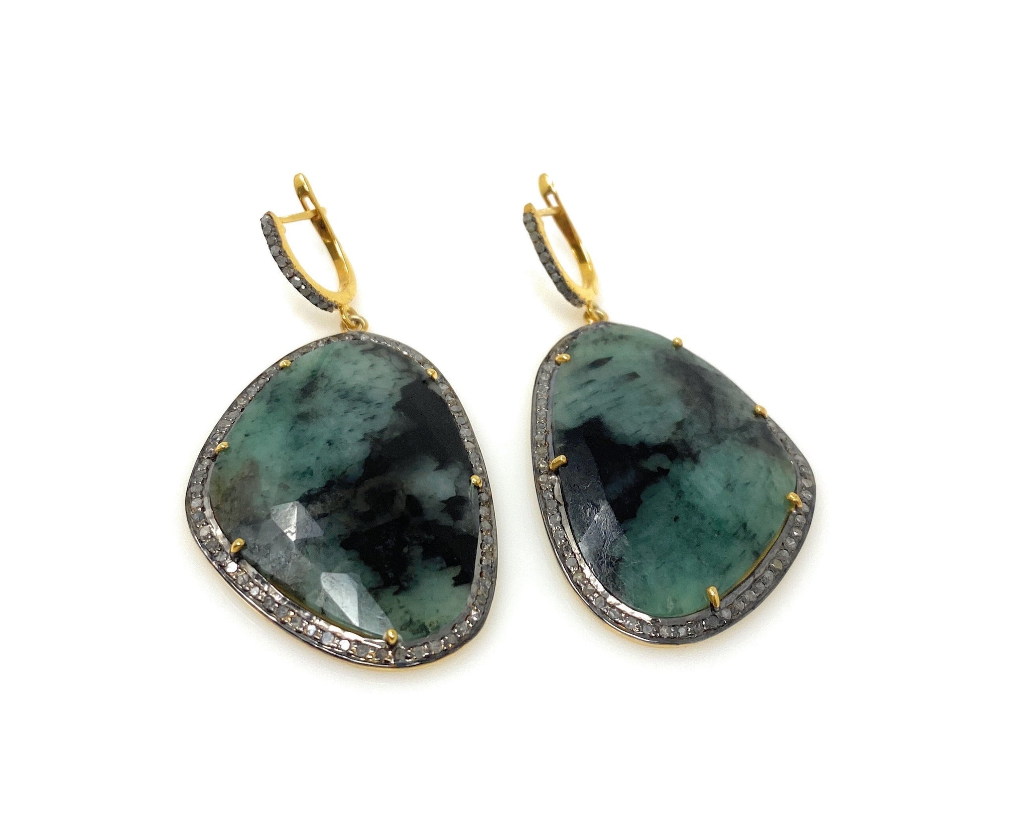 Genuine Emerald Pave Diamond Earrings, Natural Gemstone Earrings, Victorian Jewelry Gifts for Her