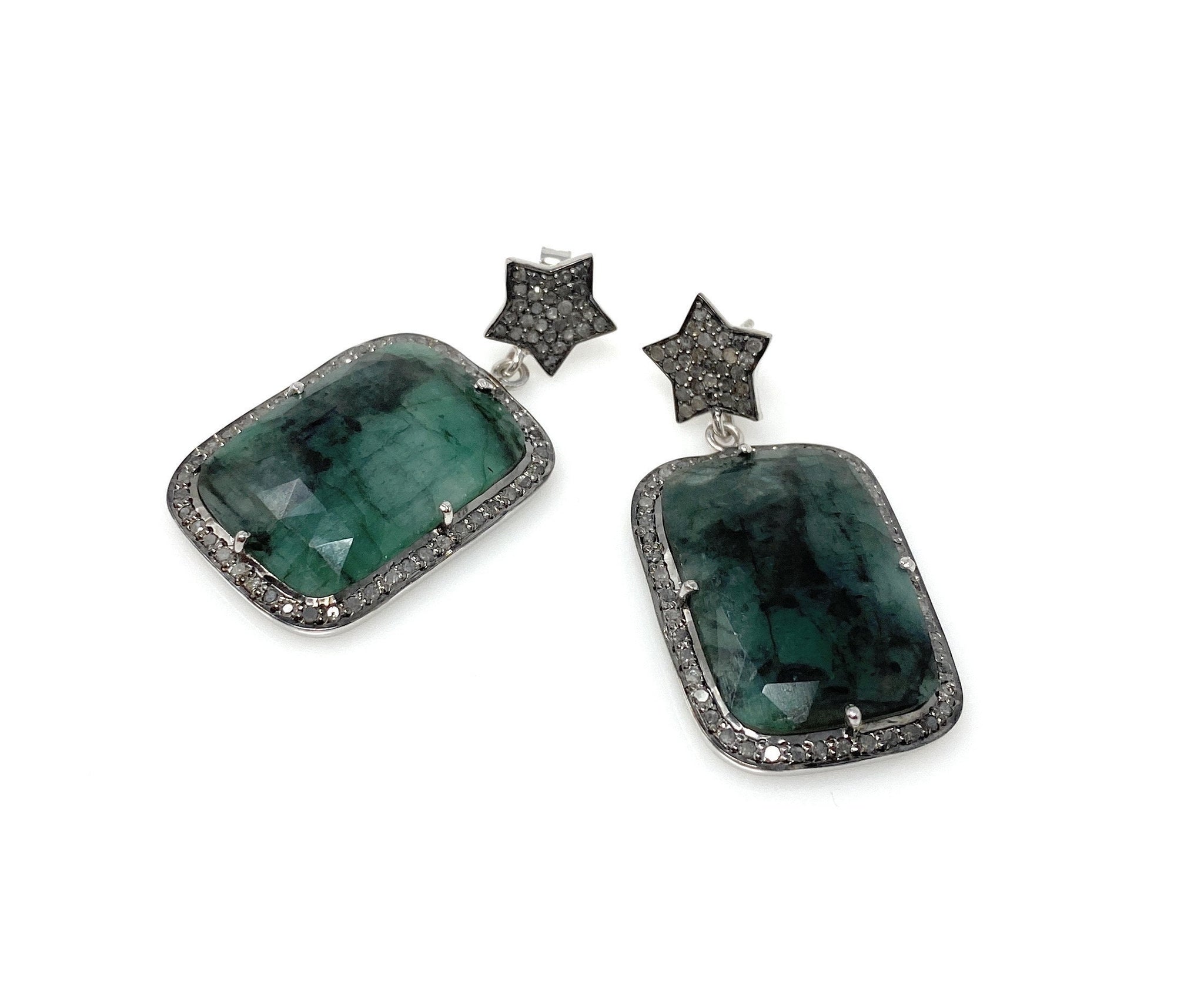 These beautiful Emerald Earrings are handmade with meticulous care using genuine diamonds bezel set in Grayish Black Rhuthenium over Sterling Silver.
