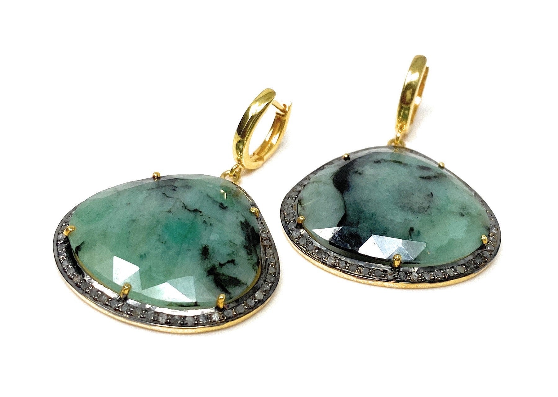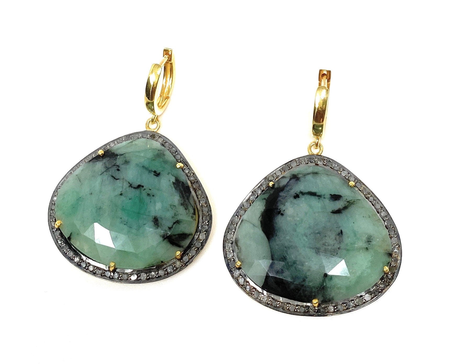 These beautiful Emerald Earrings are handmade with meticulous care using genuine diamonds and Natural Gemstone bezel set in Black Rhuthenium over Sterling Silver and 14K Gold Plated.
