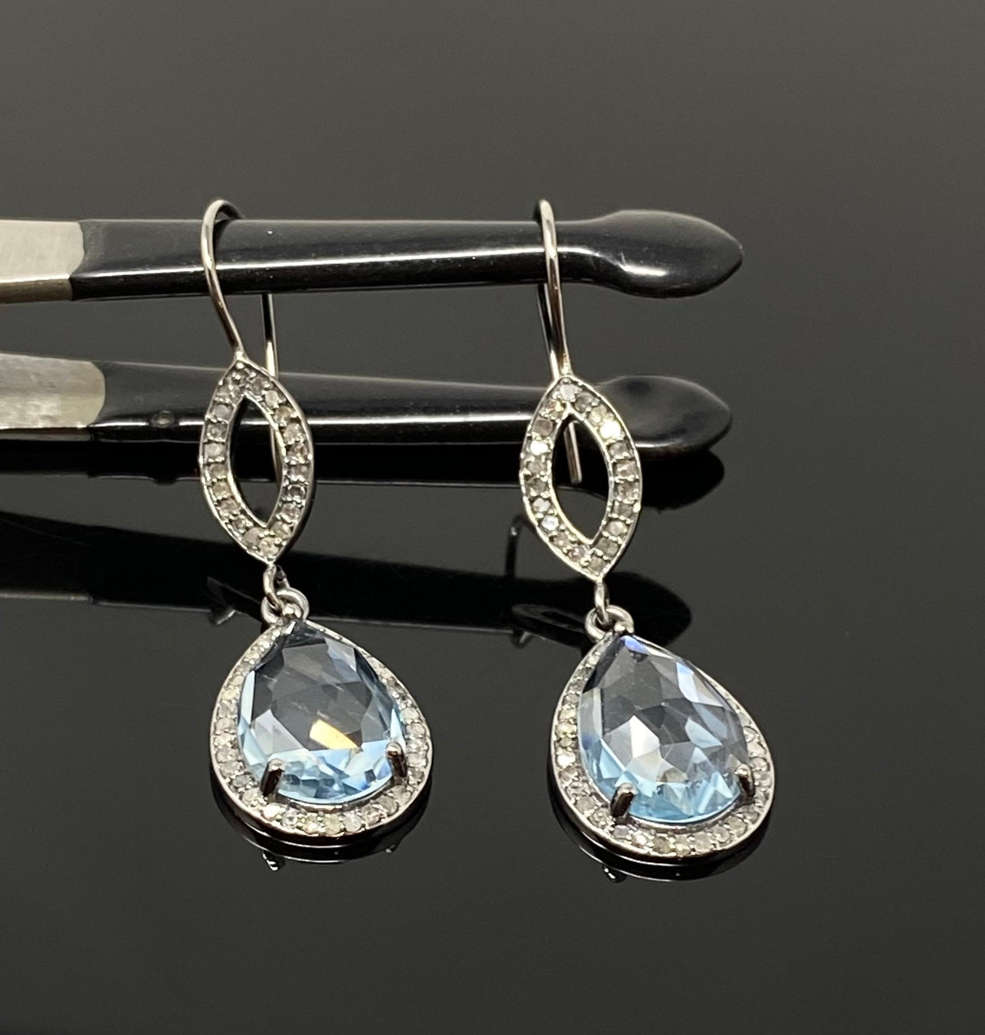 Genuine Sky Blue Topaz Pave Diamond Earrings, Black Rhuthenium over Sterling Silver Gemstone Earrings, Vintage Jewelry, 1.85” x 0.55”