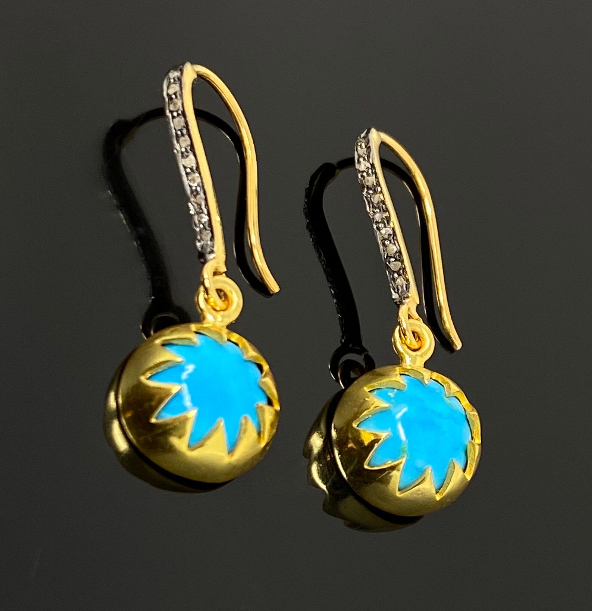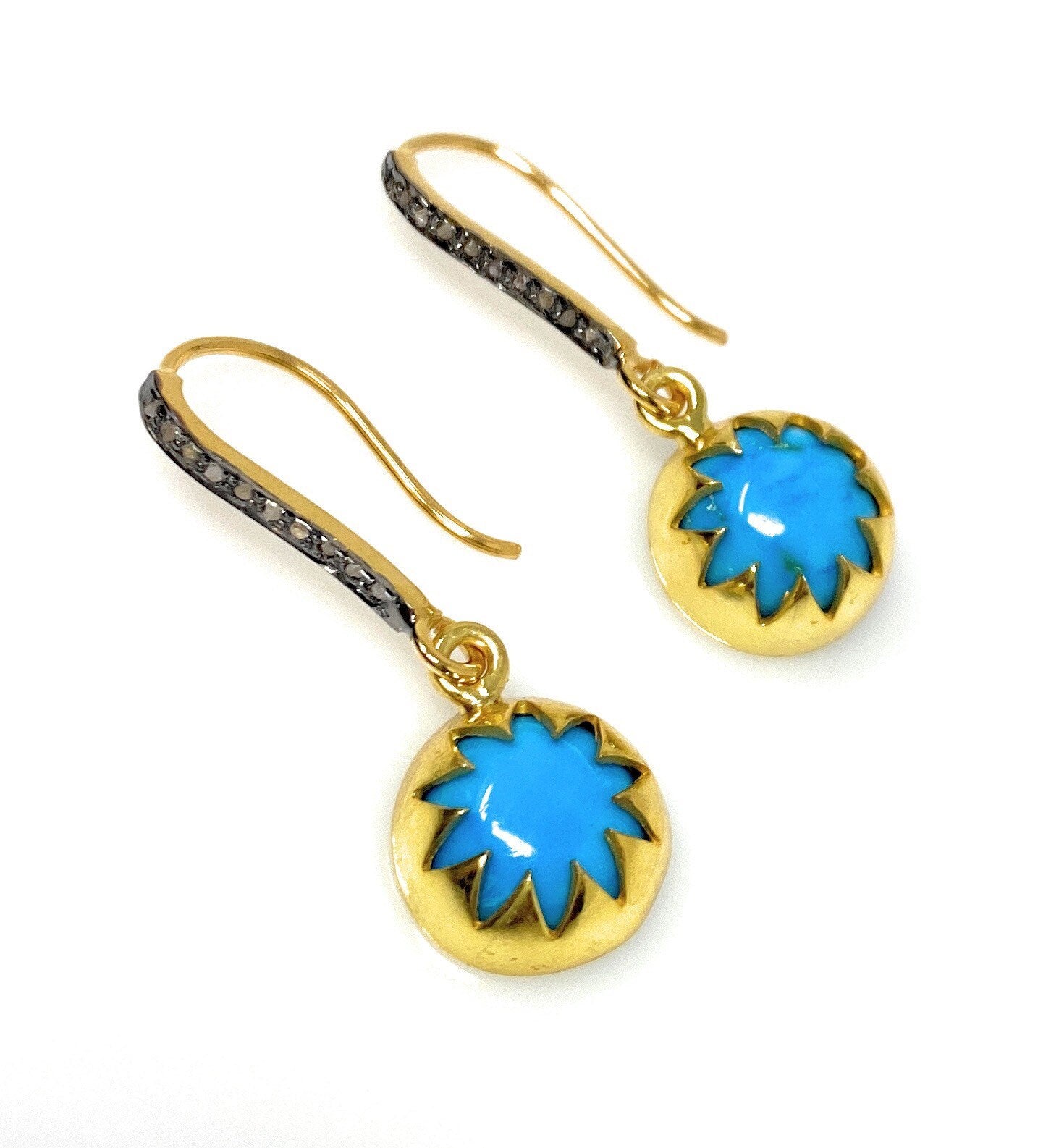 These beautiful Earrings are made with meticulous care using genuine diamonds and Howlite Turquoise set in 14K Gold Plated Sterling Silver .