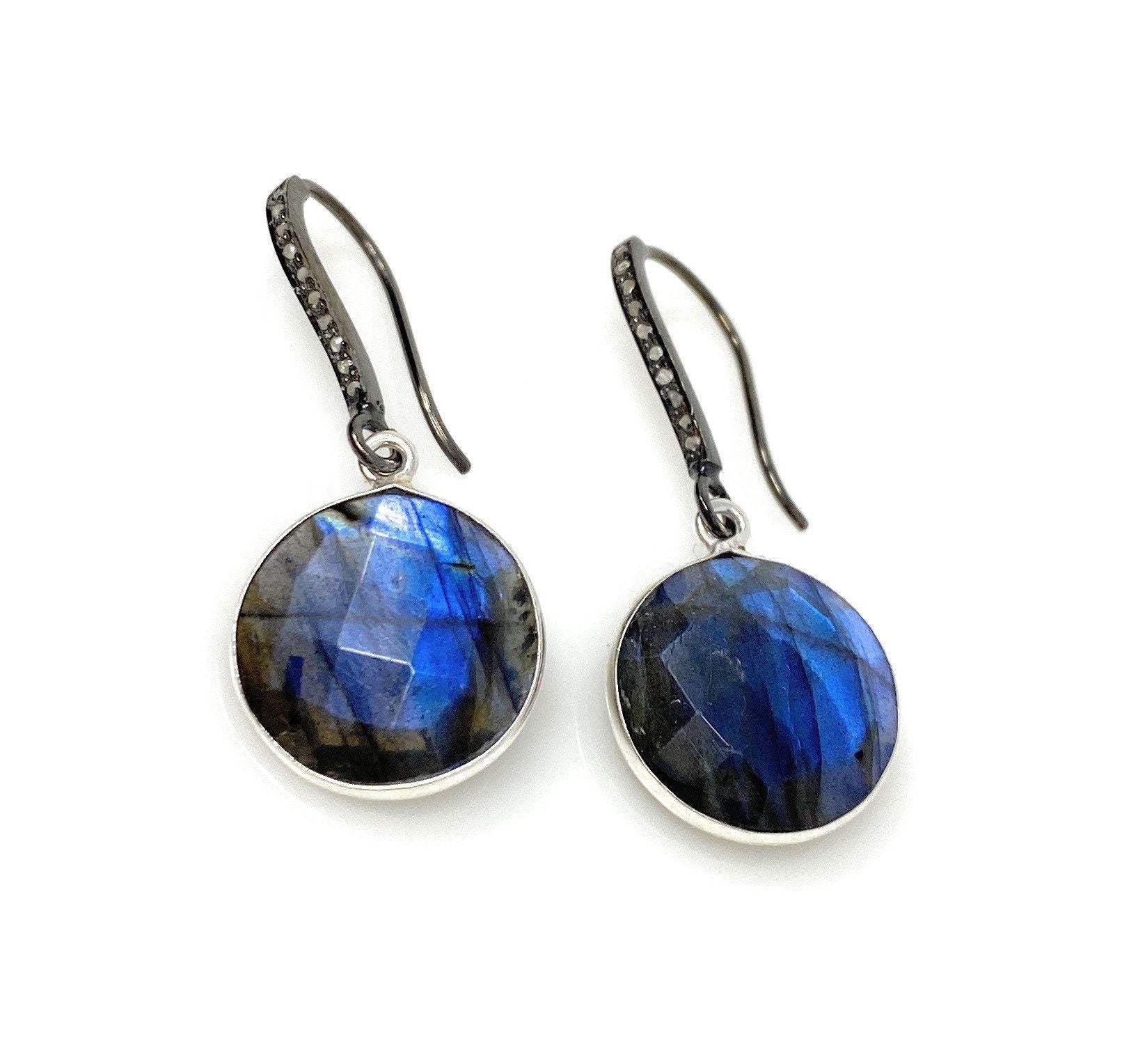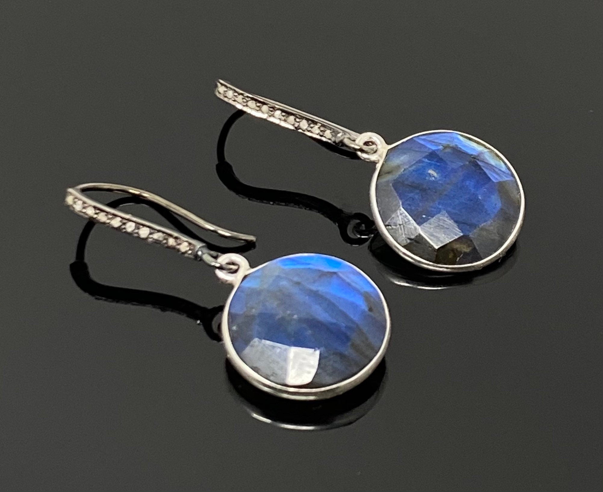 These beautiful Earrings are made with meticulous care using genuine diamonds on Black Rhodium Sterling Silver ear wires and Natural Faceted Blue Flash Labradorite bezel set in Sterling Silver.