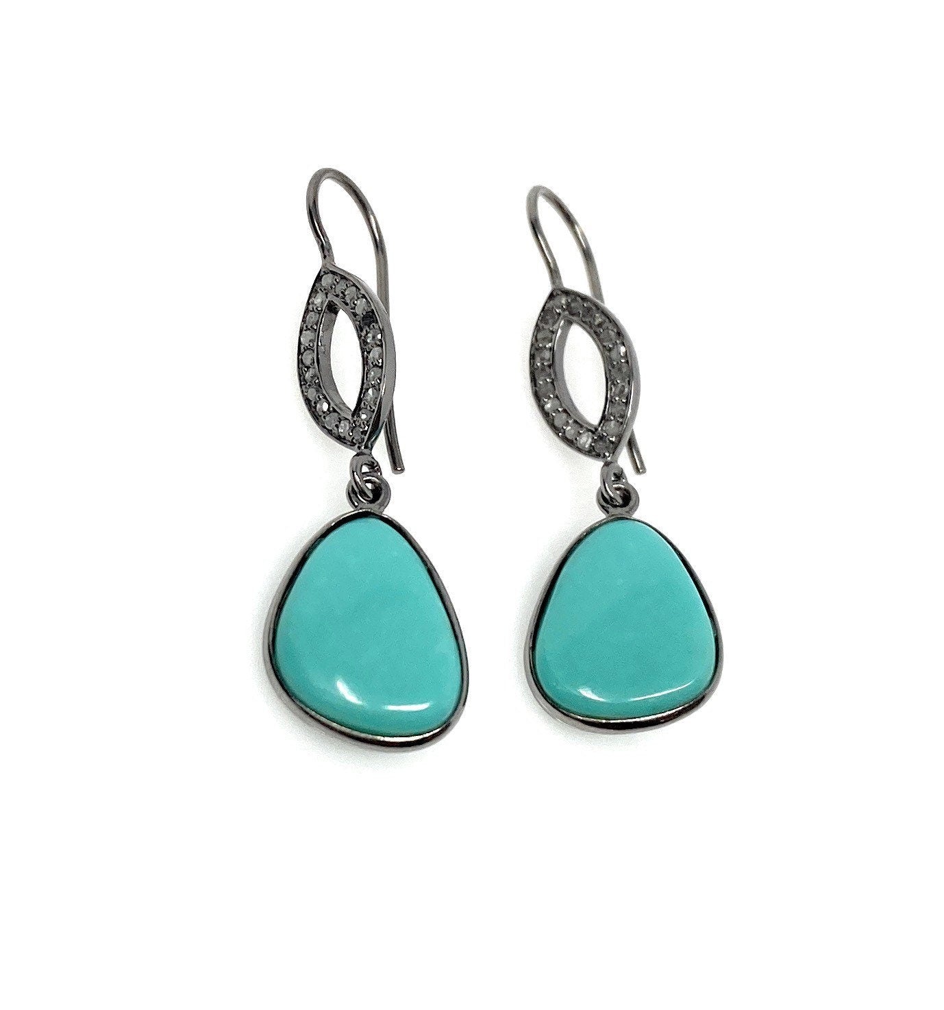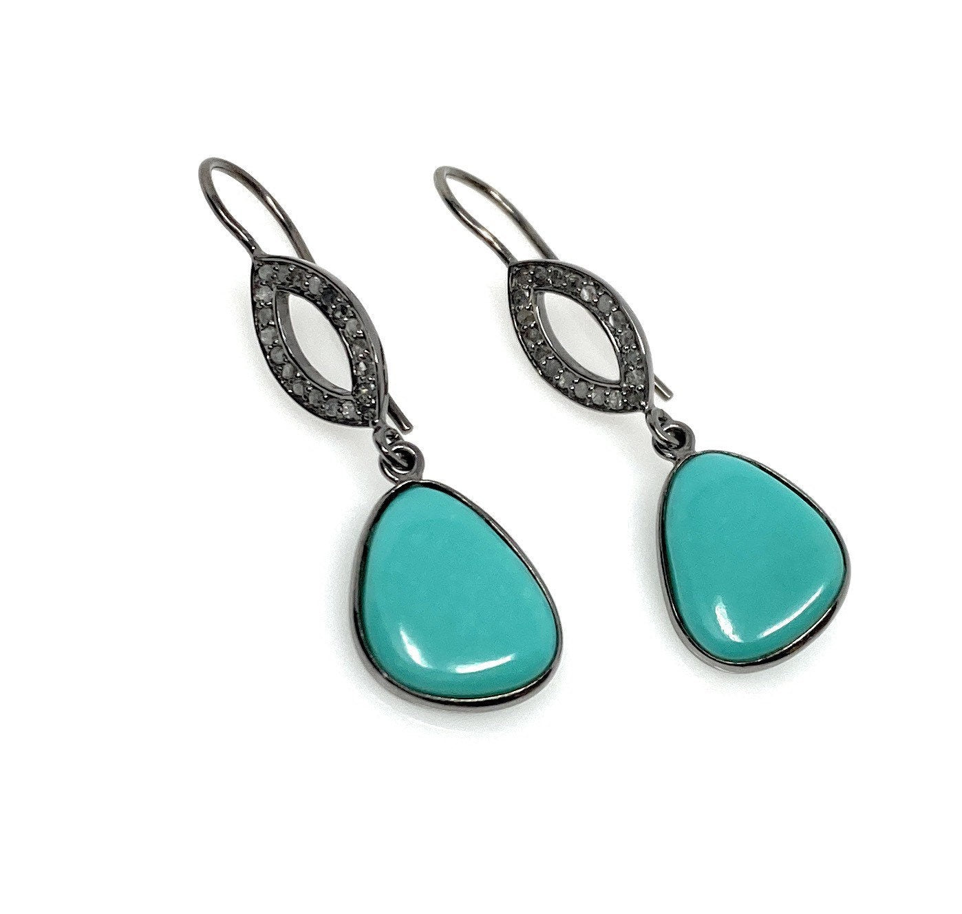 Natural Sleeping Beauty Turquoise Earrings, Pave Diamond Earrings, Victorian Gemstone Earrings, Robin Egg Turquoise, 1.65” x 1.50”
