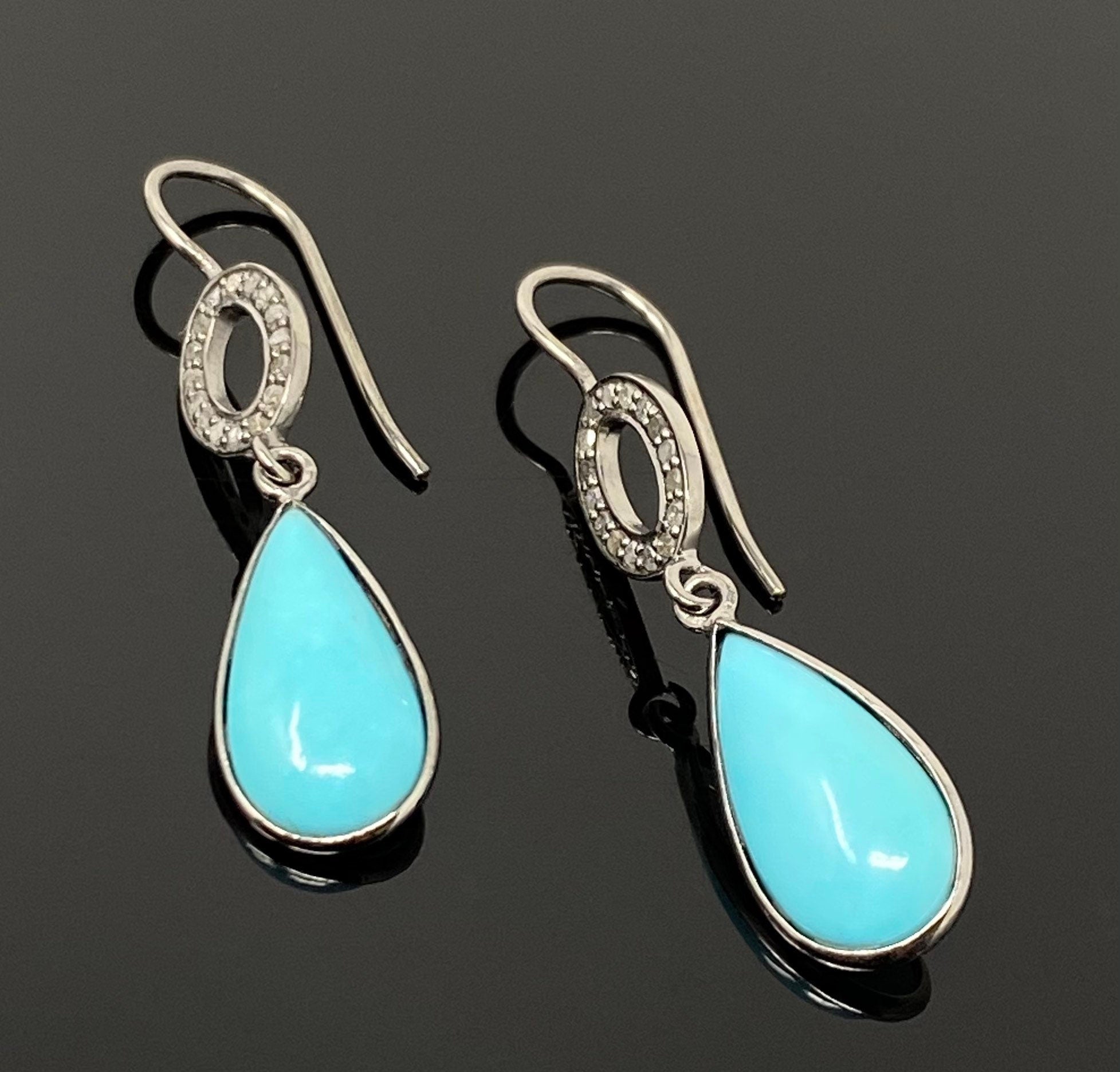 Natural Sleeping Beauty Turquoise Earrings, Pave Diamond Earrings, Victorian Gemstone Earrings, Robin Egg Turquoise, 1.60” x 0.35”