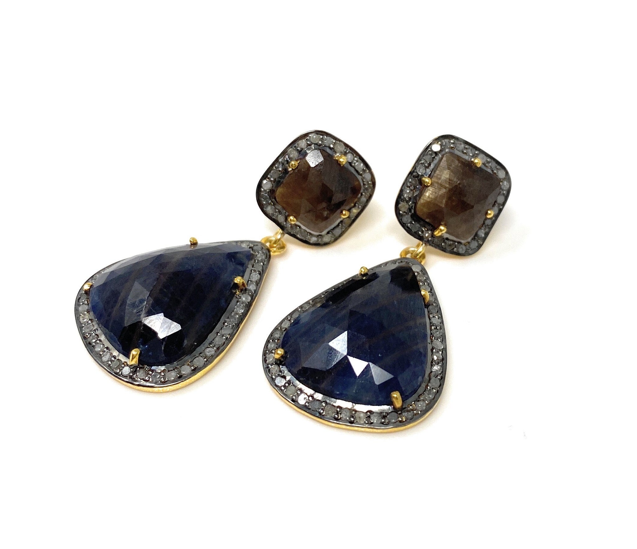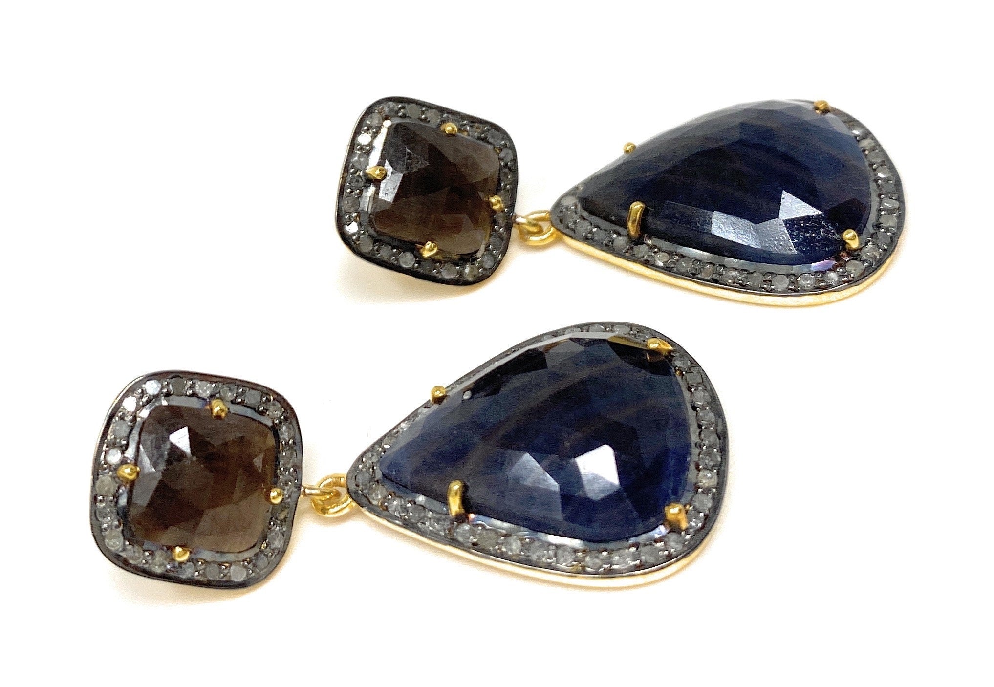 Pave Diamond Earrings, Blue Sapphire and Smoky Sapphire Earrings, Antique Look Silver Gemstone Earrings, Gifts for Her