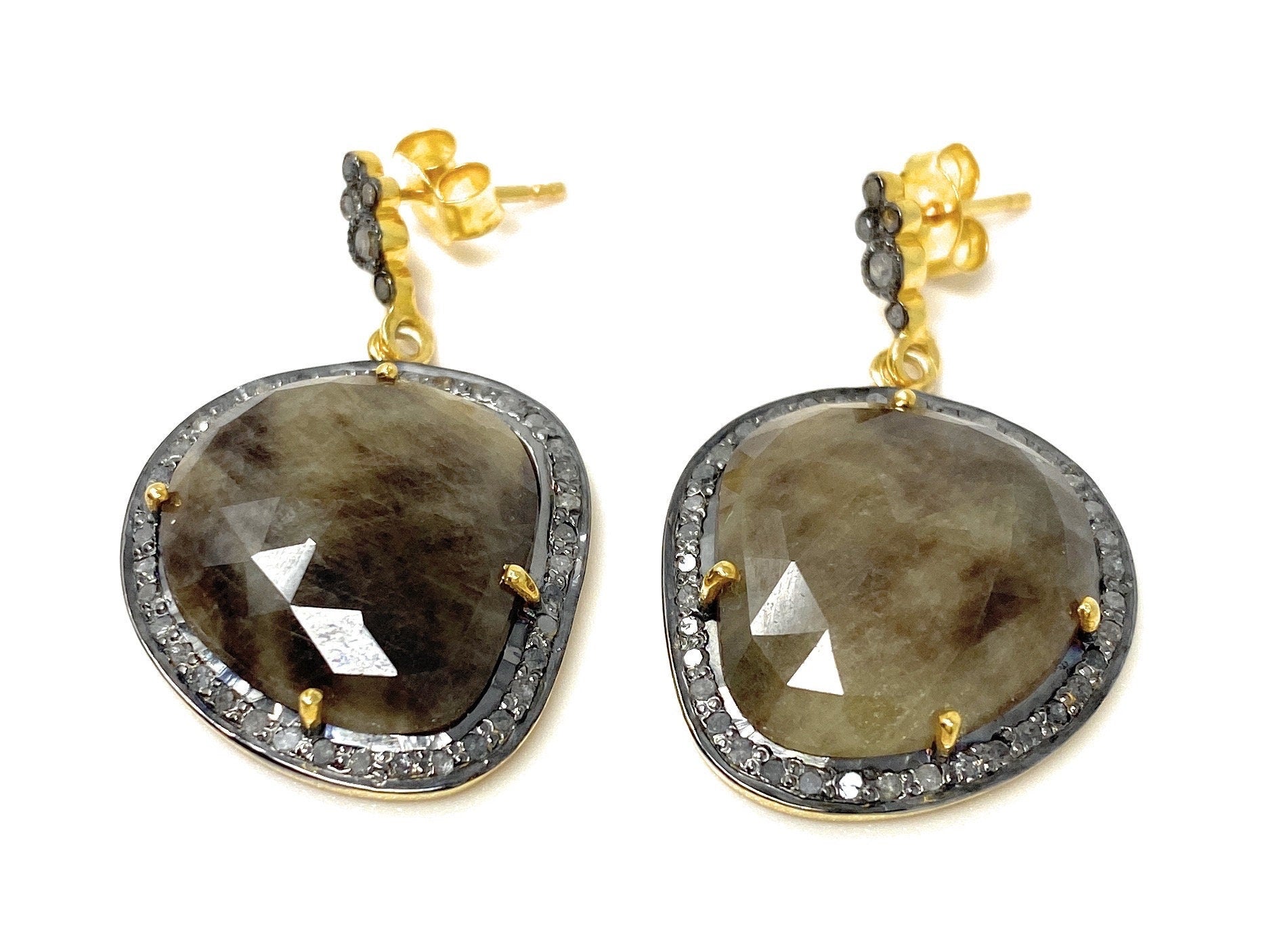 Pave Diamond Fancy Sapphire Earrings, Rare Natural Smokey Sapphire Earrings , Victorian Jewelry Gifts for Her