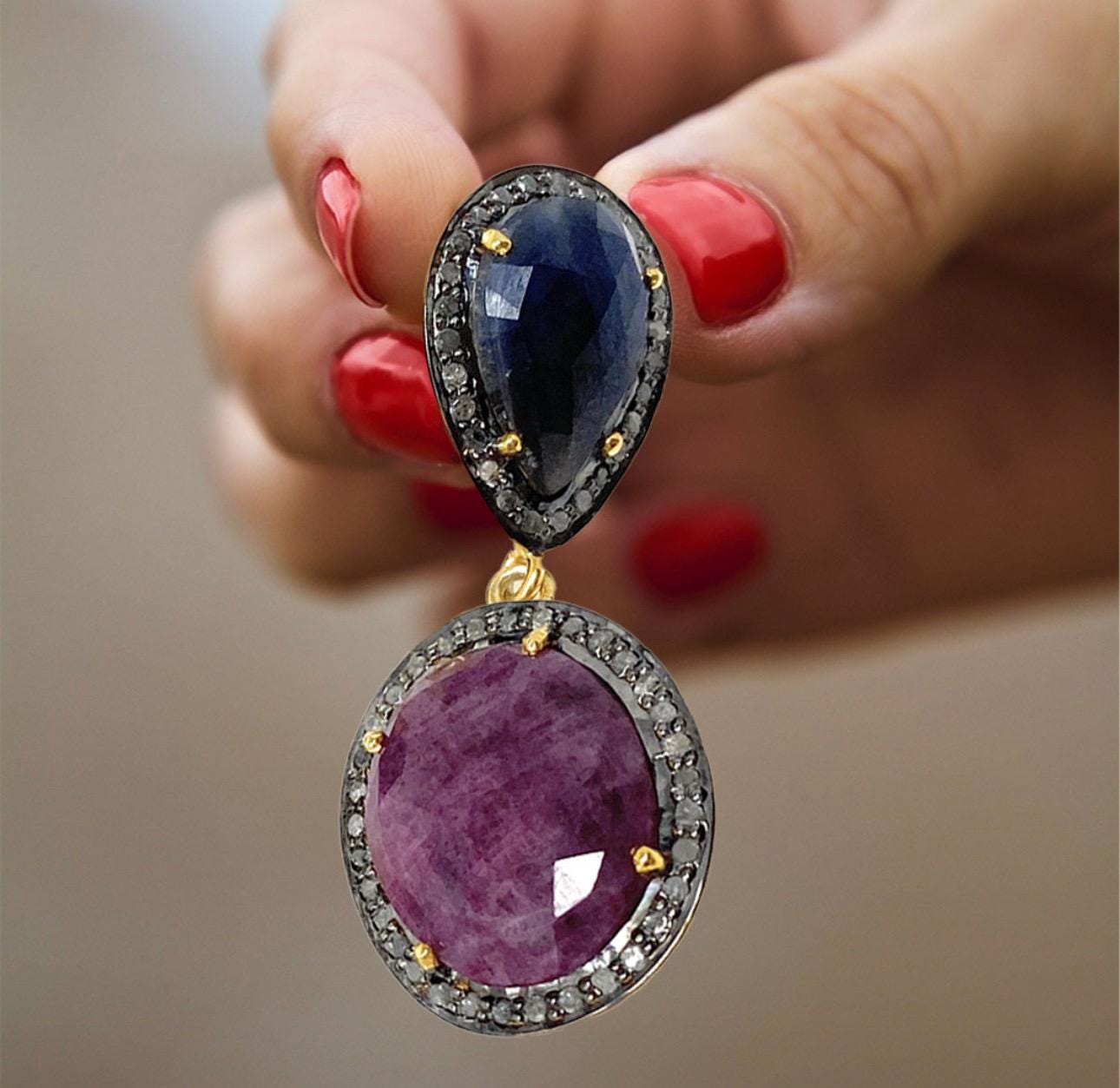 Pave Diamond Ruby and Blue Sapphire Earrings, Gemstone Earrings, Victorian Jewelry