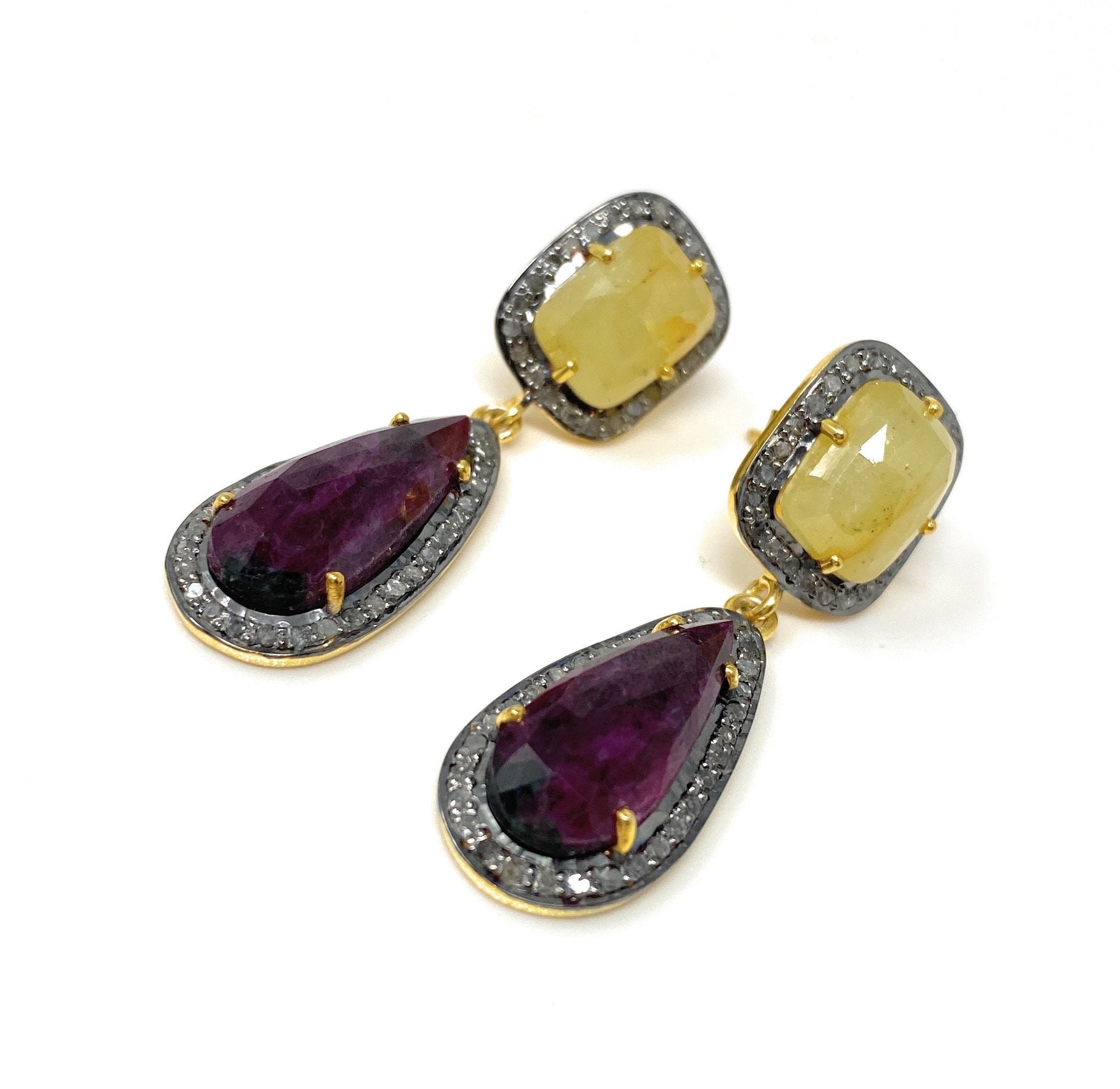 Pave Diamond Ruby and Yellow Sapphire Gemstone Earrings, Victorian Jewelry