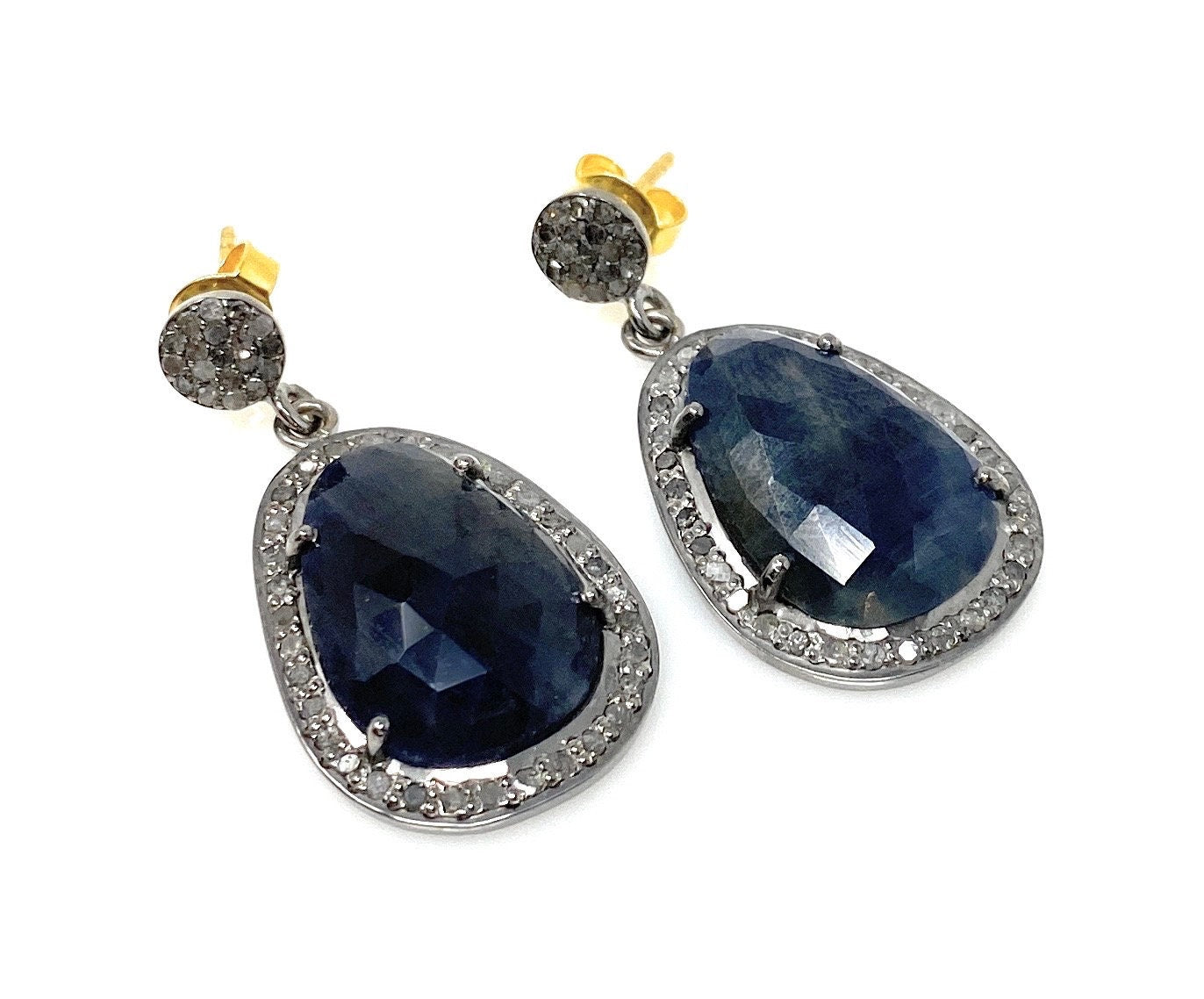 These beautiful Rose Cut Sapphire Earrings are handmade with meticulous care using genuine diamonds and Natural Gemstones bezel set in Black Rhuthenium over Sterling Silver and 14K Gold Plated Post.